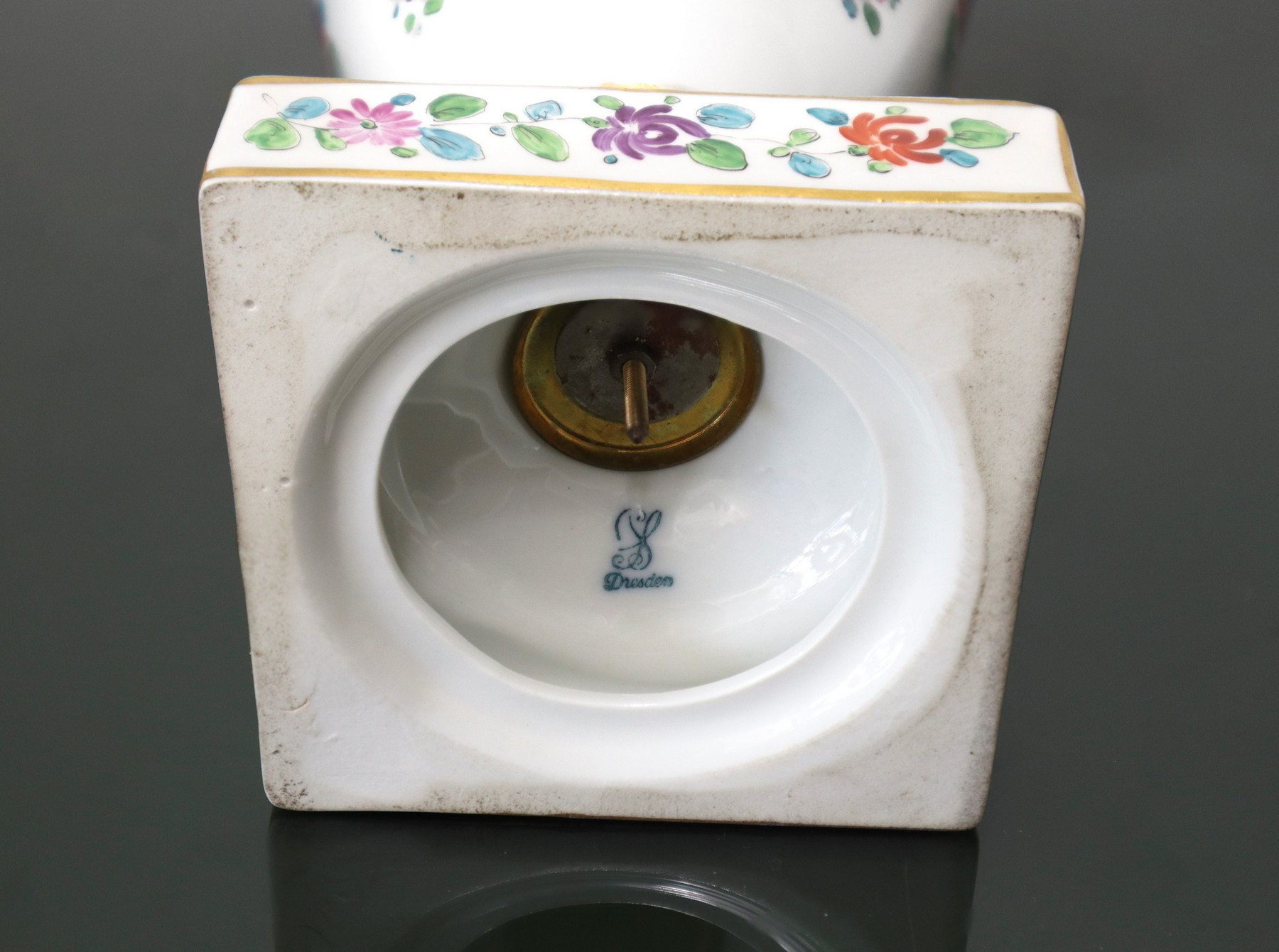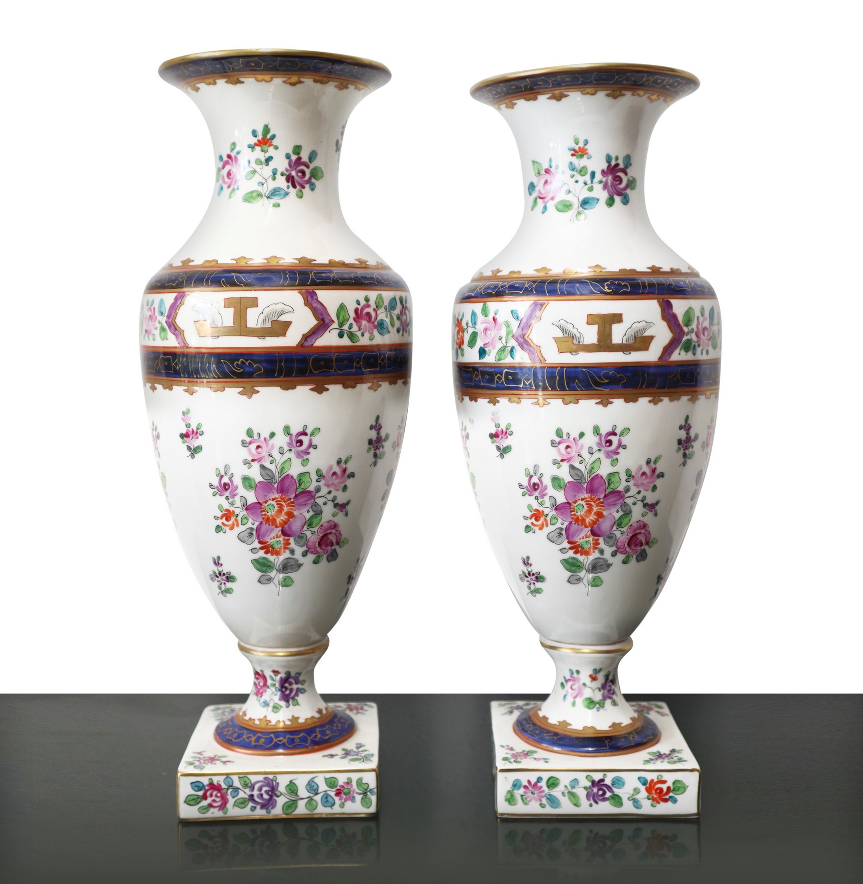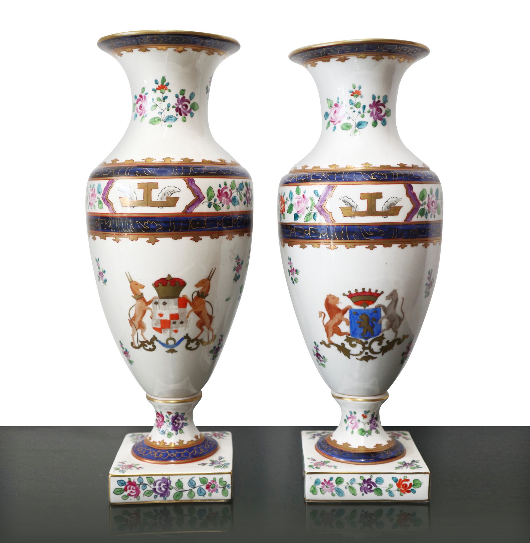 Dresden Porcelain - Coppia di vasi in porcellana h cm 34,5 di cui base cm 2; h cm 33,5 di cui base cm 2 Con rappresentazioni sul fronte di cani e stemmi, presenti decorazioni dorate e di fiori Con rappresentazioni sul fronte di cani e stemmi, presenti decorazioni dorate e di fiori