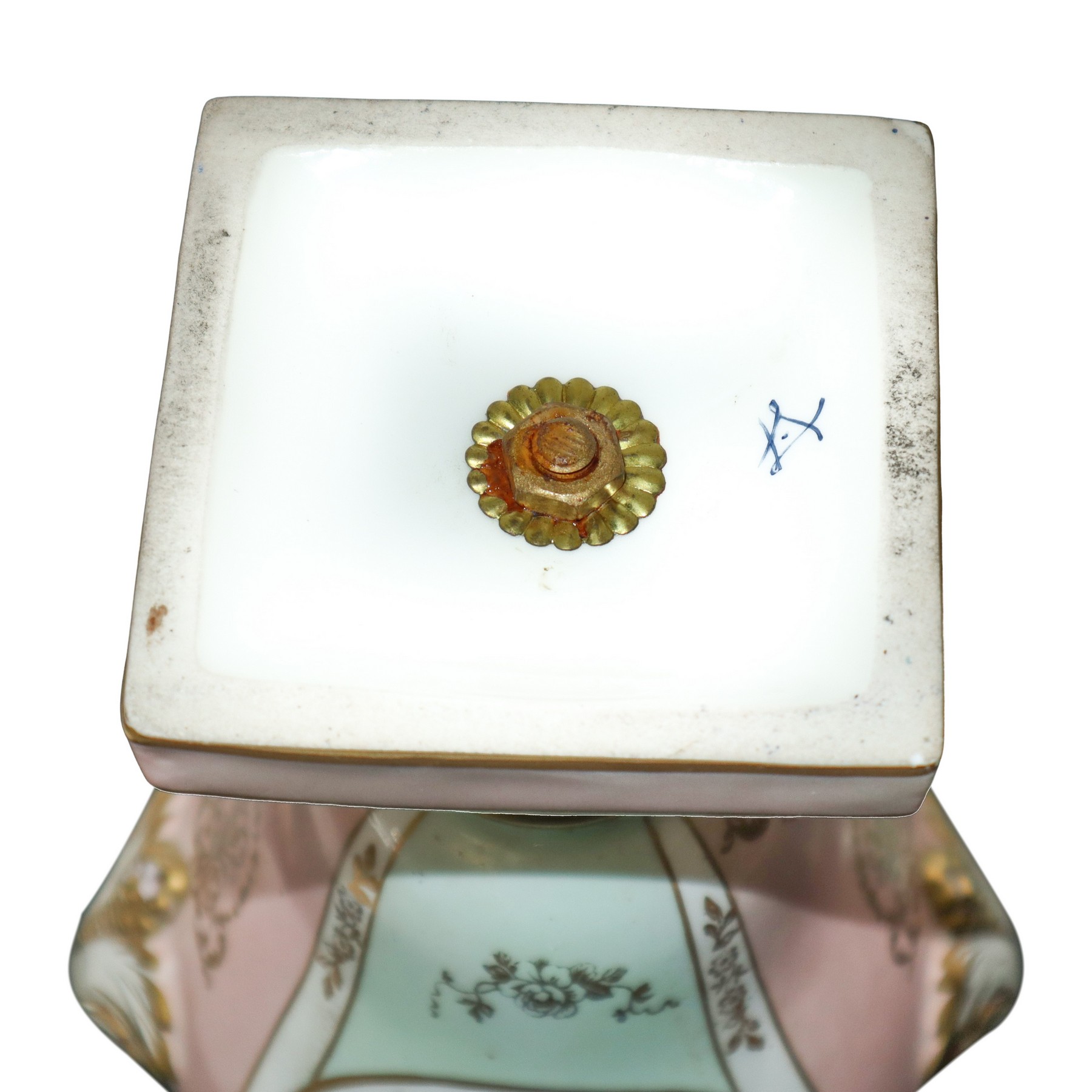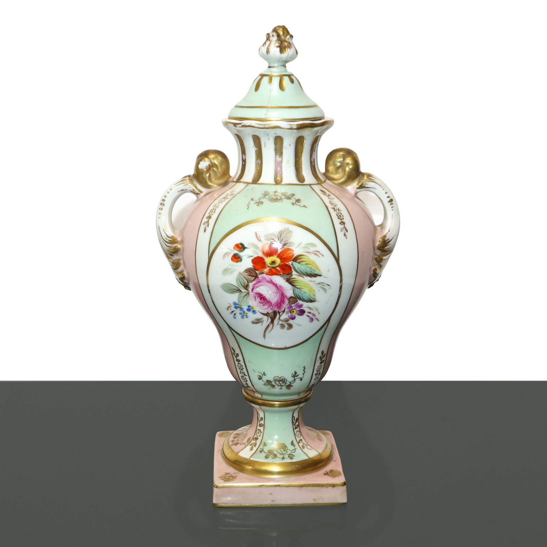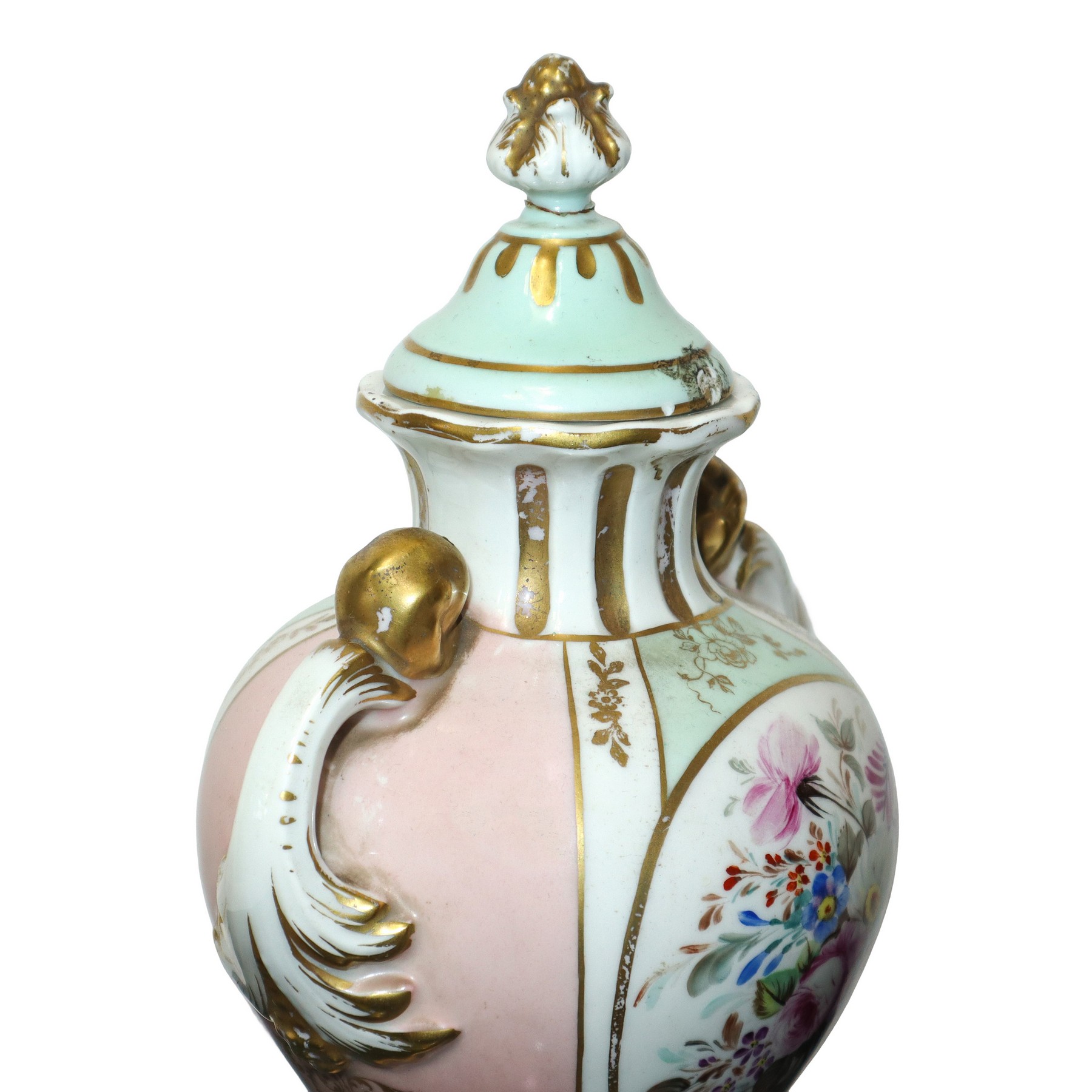 Sevres Porcellana - Vaso poutiche policromo a motivi floreali h cm 32 base cm 9X9 Marchio alla base. Piccola sbeccatura e filature sul coperchio Marchio alla base. Piccola sbeccatura e filature sul coperchio