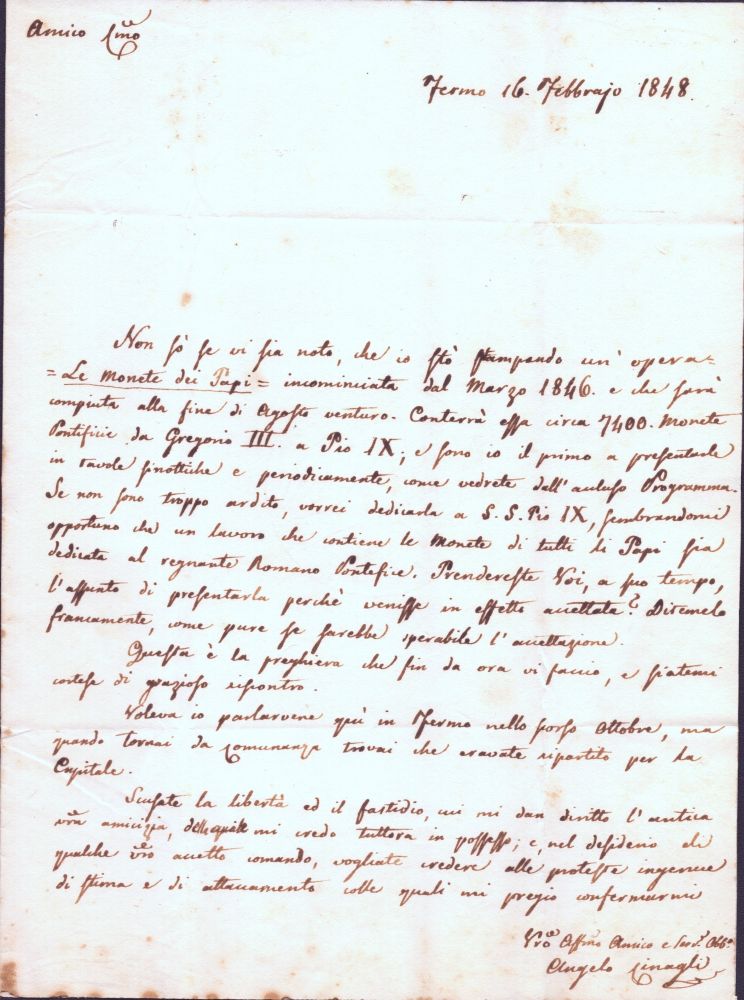 Ex Lotto 8: Lettera manoscritta, datata Fermo, 16 febbraio 1848, a firma di Angelo Cinagli, autore del volume a stampa Le monete dei papi, rivolta al signor Michele Adriani a Roma, al quale viene inviato un quaderno a stampa, programma della prossima pubblicazione Delle monete dei papi descritte in tavole sinottiche