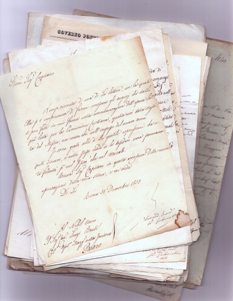 Ex Lotto 16: Corrispondenza composta da più di quindici documenti, costituita da lettere su carta intestata del Governo Pontificio, databili tra il 1820 e il 1860 ca. indirizzate al colonnello Luigi Bruti Liberati e a Filippo Bruti Liberati. Gli argomenti trattati riguardano comunicazioni militari e personali