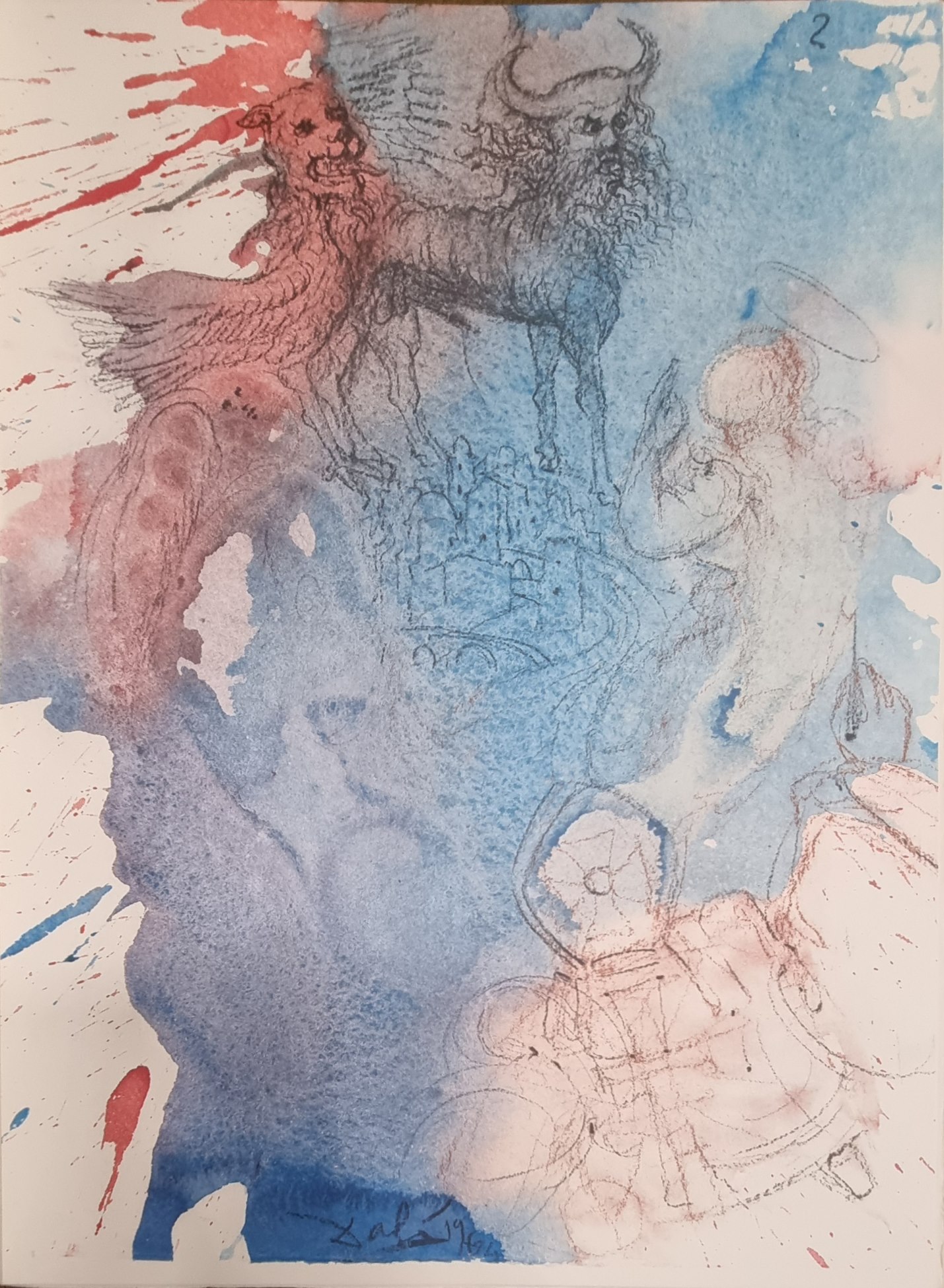 DALI' SALVADOR Spagna 1904 - 1989 "Biblia Sacra - Vulgatae Editionis" "Cherubim expandebant alas super locum Arcae et protegebant Arcam et vectes eius." Serigrafia su cartoncino pesante cm 35x48,5, firmata e datata in stampa sul fronte in basso al centro. Pubblicata a pag. 88/bis del vol. II "Biblia Sacra - Vulgatae Editionis", Rizzoli Editore 1967, tiratura 145/1499.