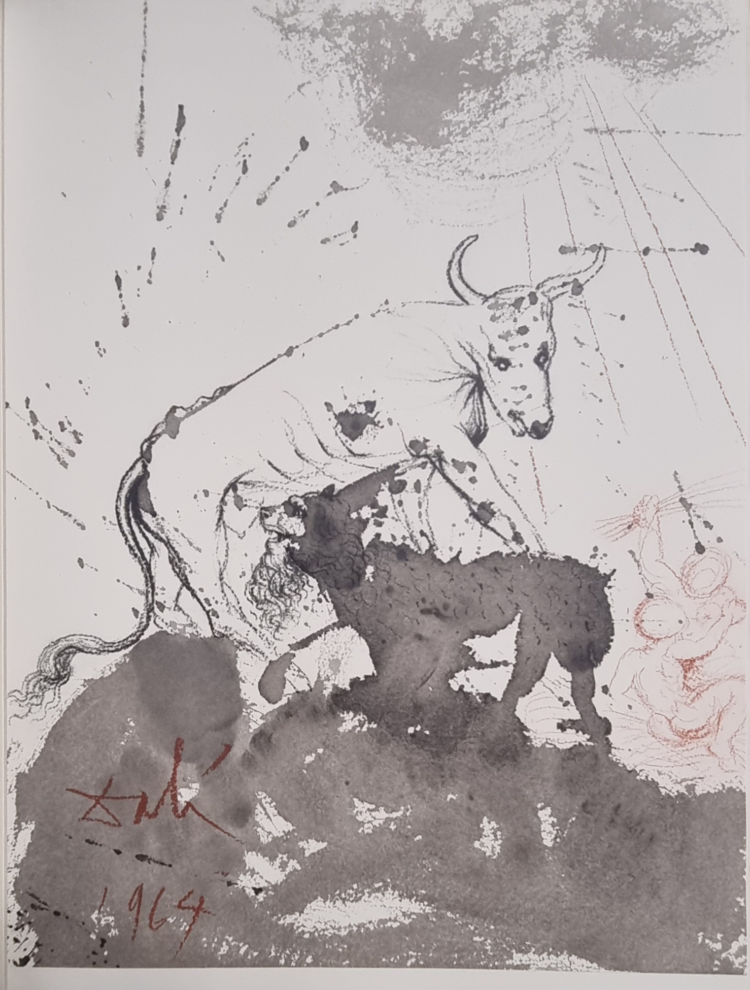 DALI' SALVADOR Spagna 1904 - 1989 "Biblia Sacra - Vulgatae Editionis" "Vitulus et ursus pascentur, simul requiescent catuli, corum; et leo quasi bos comeder paleas. Et delectabitur infans ab ubere super foramine aspidis" Serigrafia su cartoncino pesante cm 35x48,5, firmata e datata in stampa sul fronte in basso a sinistra. Pubblicata a pag. 80/bis del vol. IV "Biblia Sacra - Vulgatae Editionis", Rizzoli Editore 1967, tiratura 145/1499.