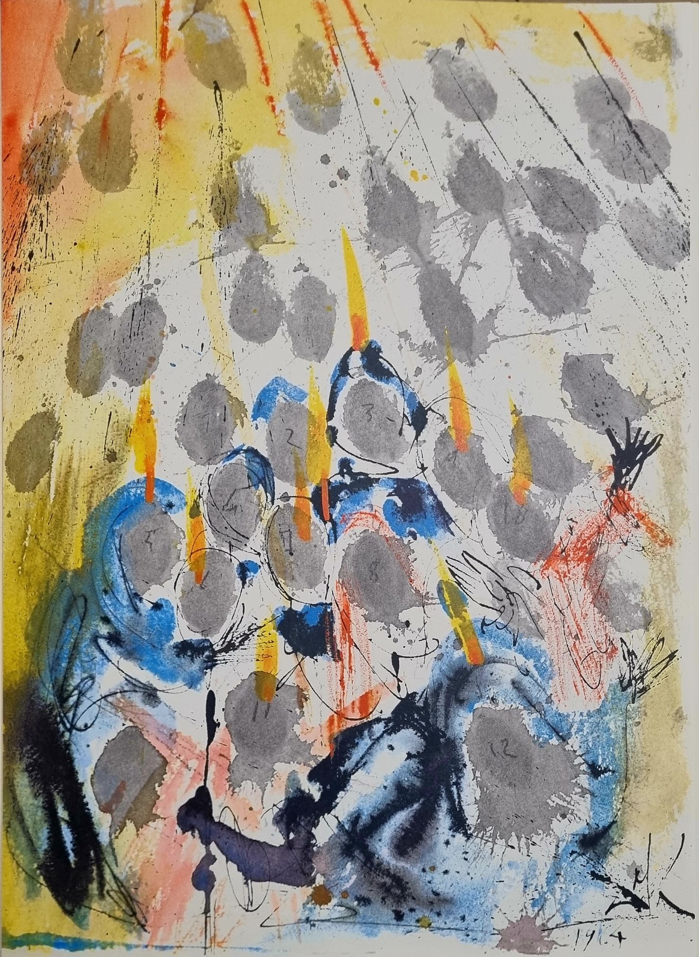 DALI' SALVADOR Spagna 1904 - 1989 "Biblia Sacra - Vulgatae Editionis" "Omnes erant perseverantes unanimiter in oratione, cum mulieribus, et Maria matre Iesu." Serigrafia su cartoncino pesante cm 35x48,5, firmata e datata in stampa sul fronte in basso a destra. Pubblicata a pag. 400/bis del vol. V "Biblia Sacra - Vulgatae Editionis", Rizzoli Editore 1967, tiratura 145/1499.