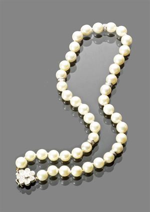 COLLANA Collana di perle giapponesi diam mm 8,50-9,00 con fermaglio e distanziali in oro bianco con incastonati diamanti taglio brillante per complessivi ct 0,60 japanese 8,50 - 9.00 mm pearl necklace with white gold and brillant cut diamond spacers as well as clasp apprx total 0,60 kt.
