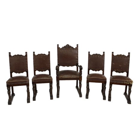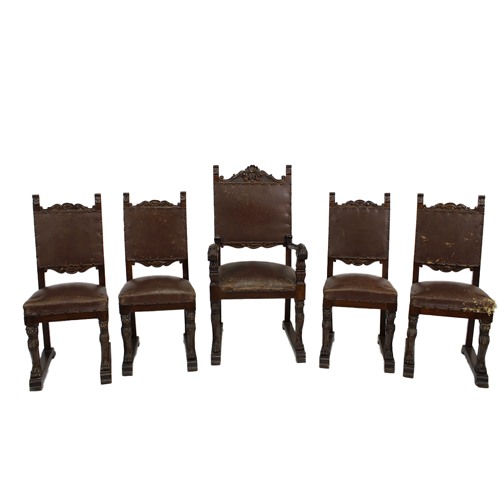 LOTTO COMPOSTO DA quattro sedie ed un capotavola in legno di noce riccamente scolpiti con gambe figure leonine alate seduta e spalliera in cuoio Sicilia XIX secolo sedie h cm 102 x 45 x 48 - capotavola h cm 120 x 60 x 68