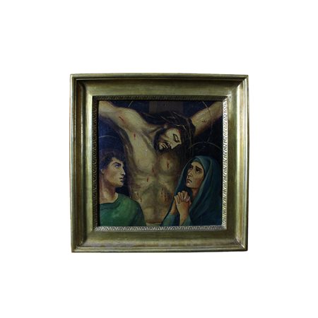 OLIO SU LASTRA DI METALLO raffigurante la passione di cristo dentro cornice a canna ciaccata in legno dorato ad argento e mecca maestranze italiane XIX secolo h cm 40 x 40 - cornice h cm 52 x 52