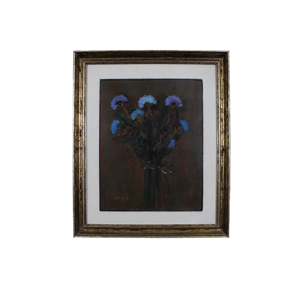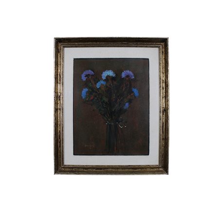 OLIO SU TELA "Questi stani fiori azzuri" a firma Fillinbek dentro cornice in legno dorato reca sul retro titolo e firma h cm 50 x 40 - cornice h cm 66 x 55