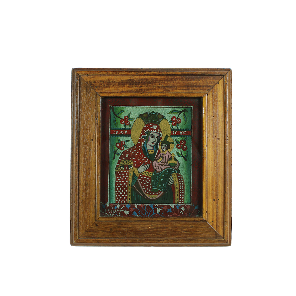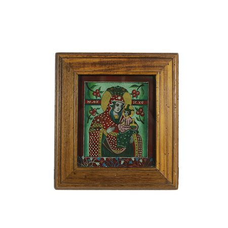 PITTURA SU VETRO raffigurante Madonna con bambino con lumeggiature in oro manifattura ortodossa dentro cornice in legno. XIX- XX secolo h cm 21,5 x 18,5