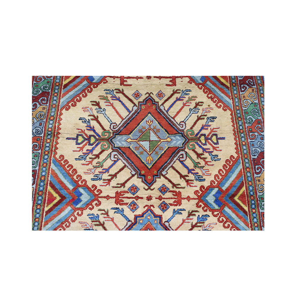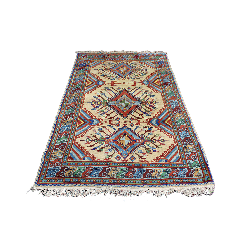TAPPETO ORIENTALE annodato a mano, fondo chiaro con motivi geometrici policromi e medaglioni centrali, bordure decorative multicolore. Vello in lana con frange alle estremità. Buone condizioni generali con normali segni d’uso. cm 250 x 155