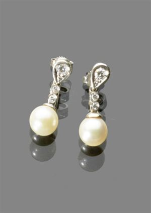 COPPIA DI ORECCHINI Coppia orecchini in oro bianco con due perle pendenti e diamanti taglio brillante per complessivi ct 0,45 ca Peso 4,70 pair of white gold earrings with pearl pendants and brillant cut diamonds approx totaling 0,45 kt weight 4.70