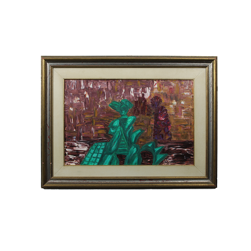 OLIO SU TELA raffigurante personaggi astratti. Firma indistinta. XX secolo h cm 40 x 57 - cornice h cm 63 x 80