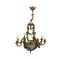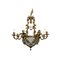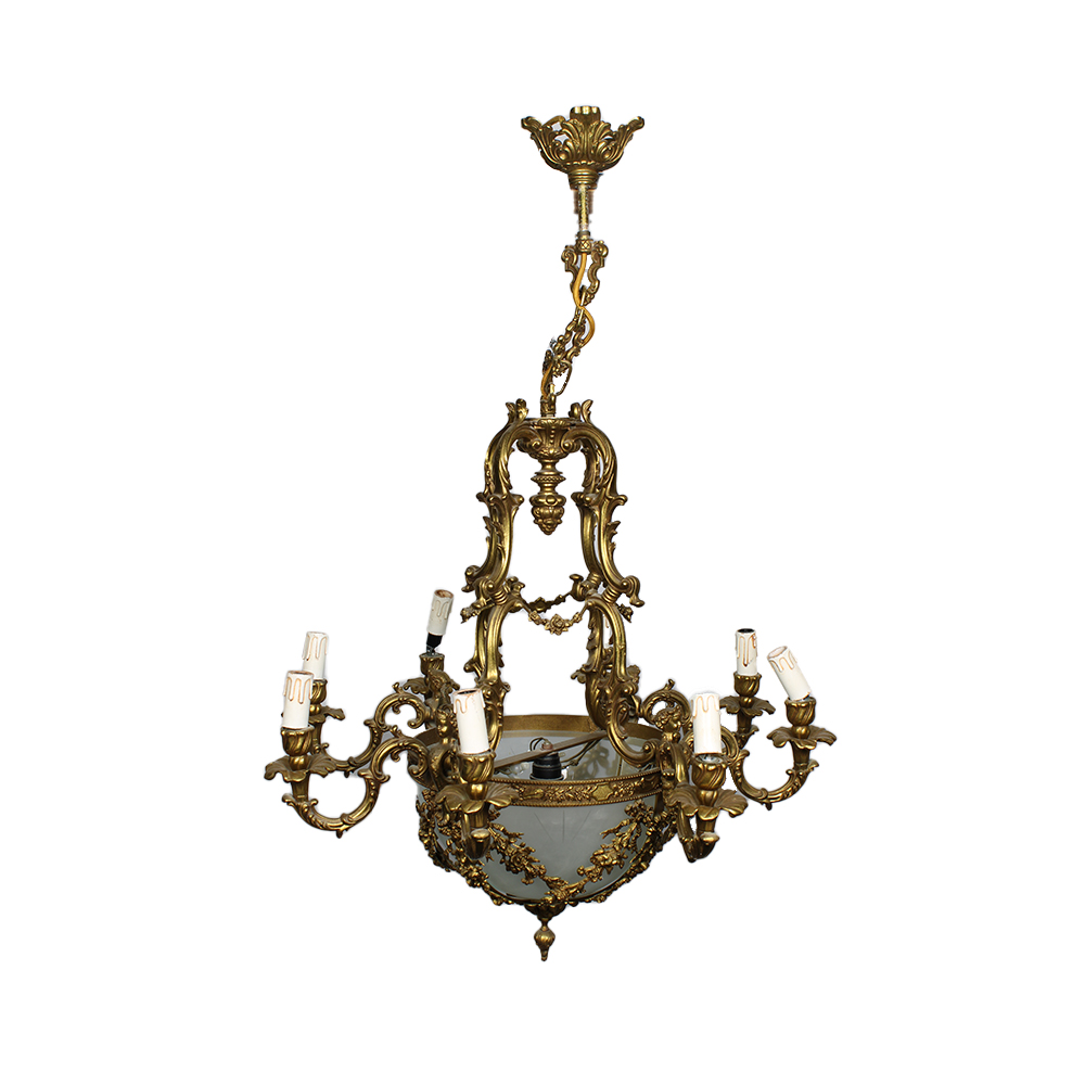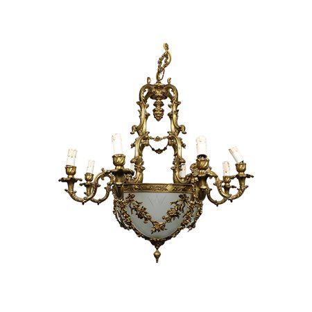 LAMPADARIO in bronzo dorato a 8 braccia sostenuto da figure femminili con coppa a quarti in vetro inciso Sicilia prima metà del 900 h cm 95 x 80 x 80