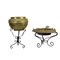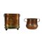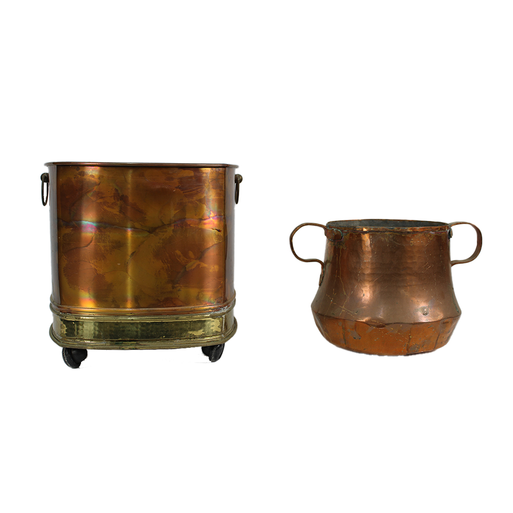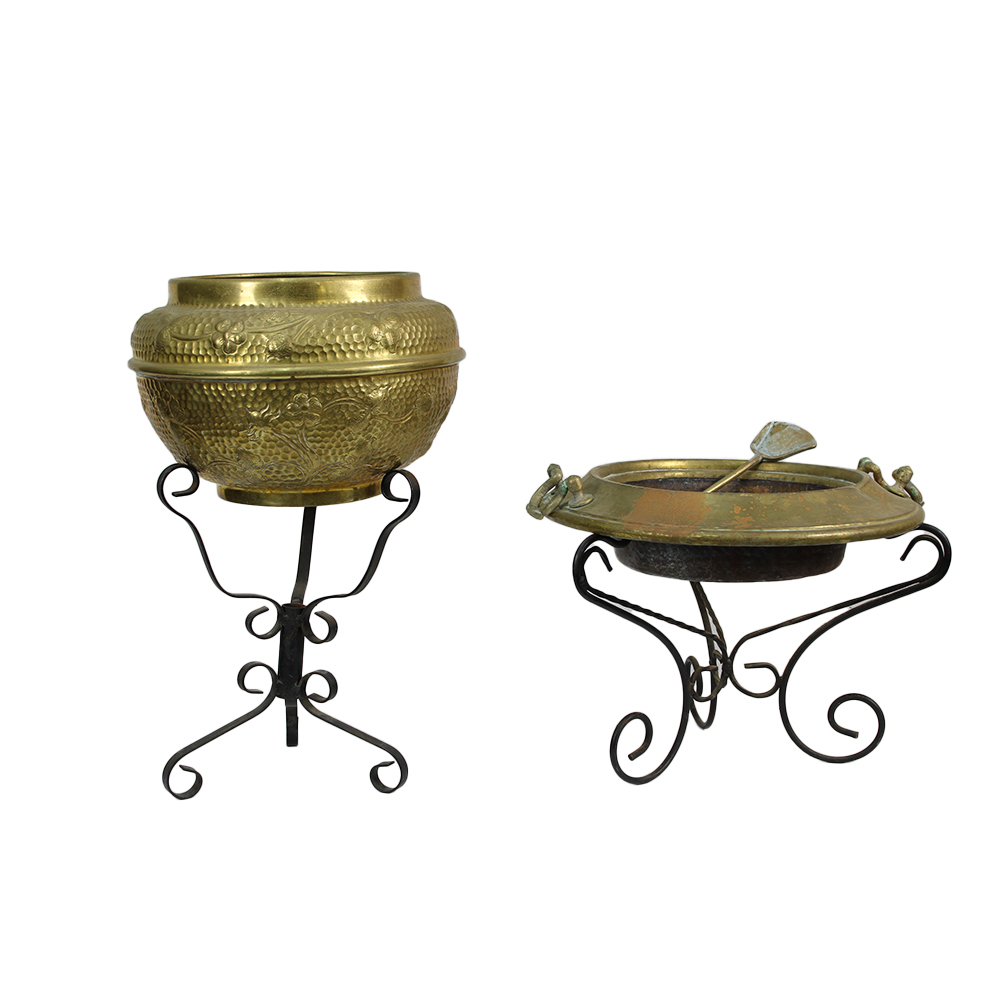 LOTTO COMPOSTO DA un braciere in ottone con base in ferro un vaso in rame finemente sbalzato e dorato con base in ferro un vaso porta piante in rame e una pentola in rame diverse manifatture XX secolo h cm 58 - h cm 32 - h cm 32 - h cm 22