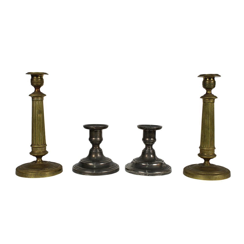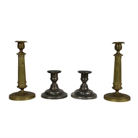 LOTTO COMPOSTO DA coppia di candelieri monocera a colonna in fusione d'ottone finemente cesellati e dorati e una coppia di candelieri monocera in metallo argentato manifattura San Marco silver plate primi 900 h cm 22 x Ø 10 - h cm 10 x Ø 10