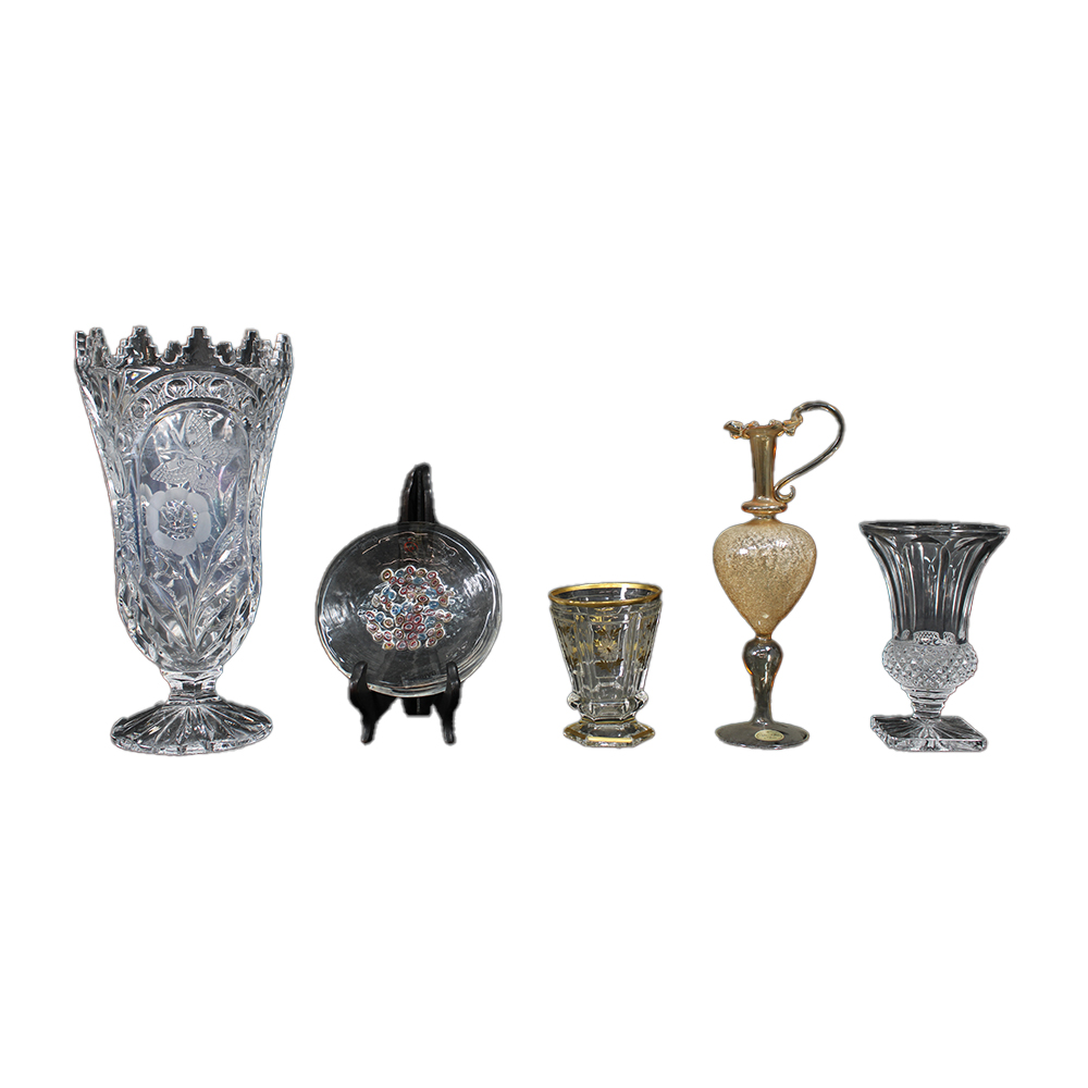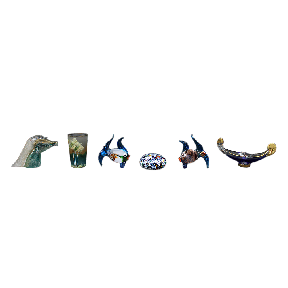 LOTTO COMPOSTO DA tre vasi due bicchieri tre sculture uno svuota tasche una gondola e un fermacarte in diversi materiali tra cui cristallo vetro e murrina diverse manifatture XX secolo misure varie