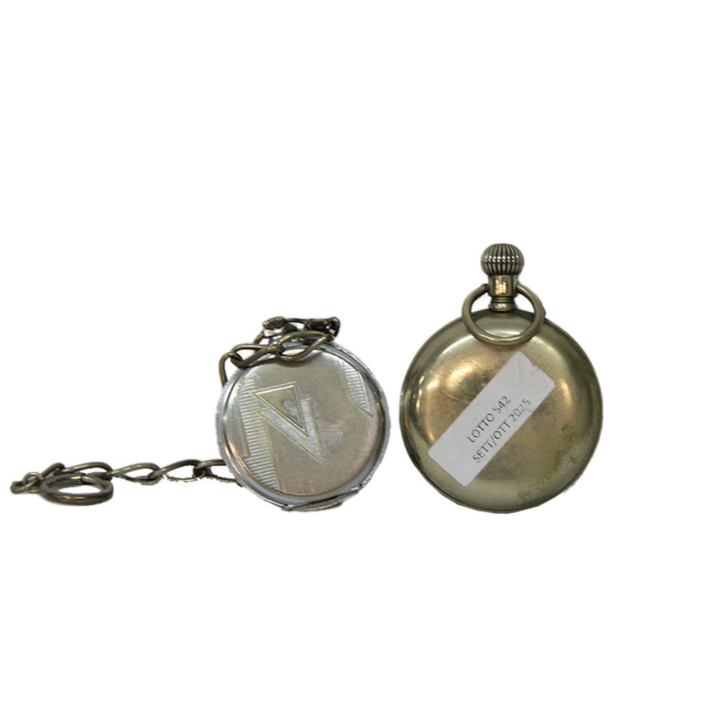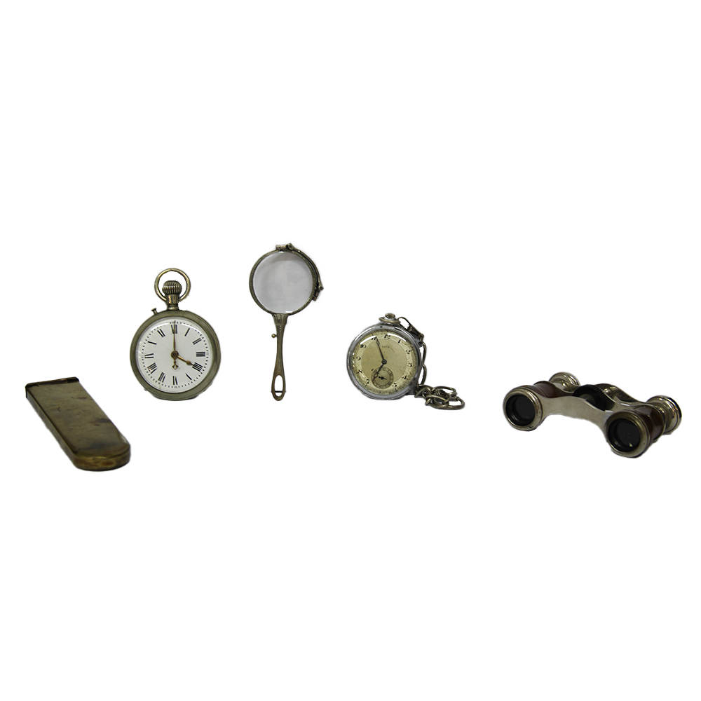 LOTTO COMPOSTO DA due orologi da tasca d'epoca, un binocolo da teatro in metallo e legno, una piccola lente d'ingrandimento in metallo e un portaocchiali in metallo. Europa XX sec misure varie
