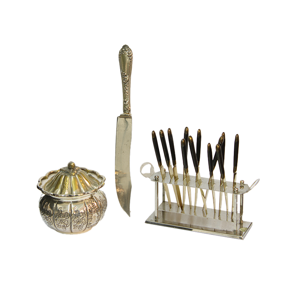LOTTO DI 3 OGGETTI IN METALLO DI CUI un vasetto con coperchio, un set di 12 coltellini Ucathus bronce con relativo contenitore e un coltello da intaglio da pasticciere. Francia Inghilterra XX sec misure varie