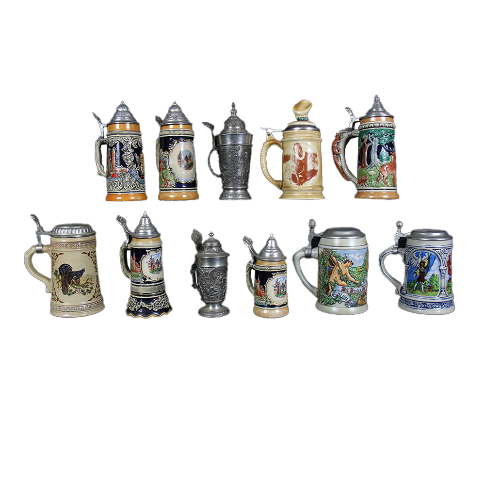 LOTTO DI 11 BOCCALI VINTAGE per birra di diverse provenienze e fattura. XX secolo misure varie
