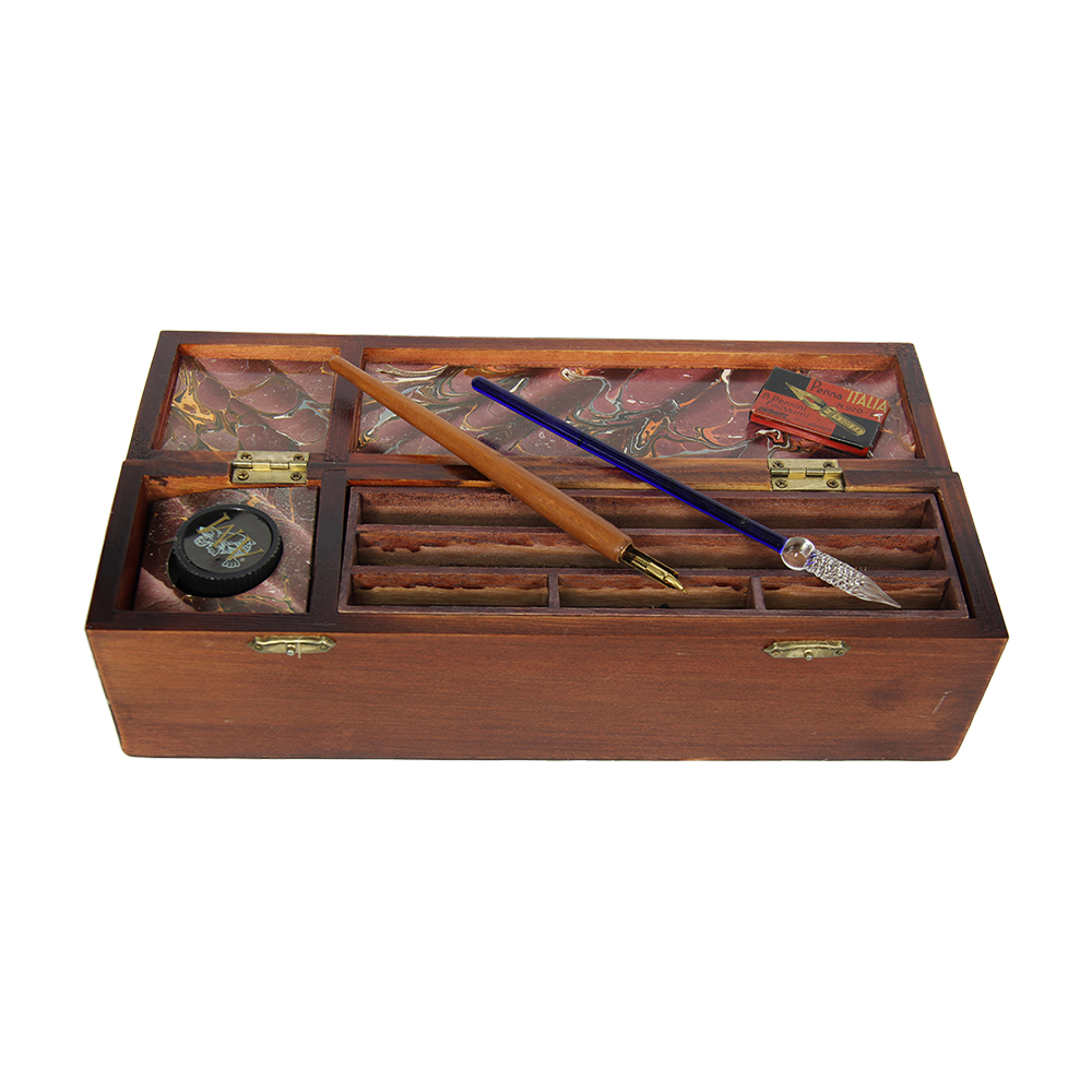 LOTTO DI DUE SET DA SCRIVANIA COMPOSTO DA 1 cassettina in legno con rifiniture in metallo dorato AM the art of writing con penna stilografica, una glass pen per calligrafia, dei pennini di ricambio e una boccettina d'inchiostro; 1 set con 2 eleganti penne in metallo con supporti e un sottomano in metallo. Italia XX secolo misure varie