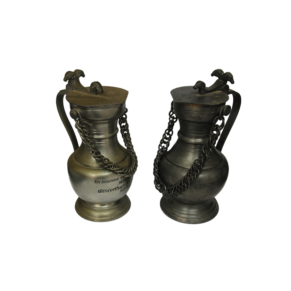 DUE BROCCHE SOUVENIR in peltro con coperchi stilizzati con caratteristiche piccole teste di ovini. Ammaccature. Svizzera 1979-82 h cm 25 x Ø 13 - h 24 x Ø 12