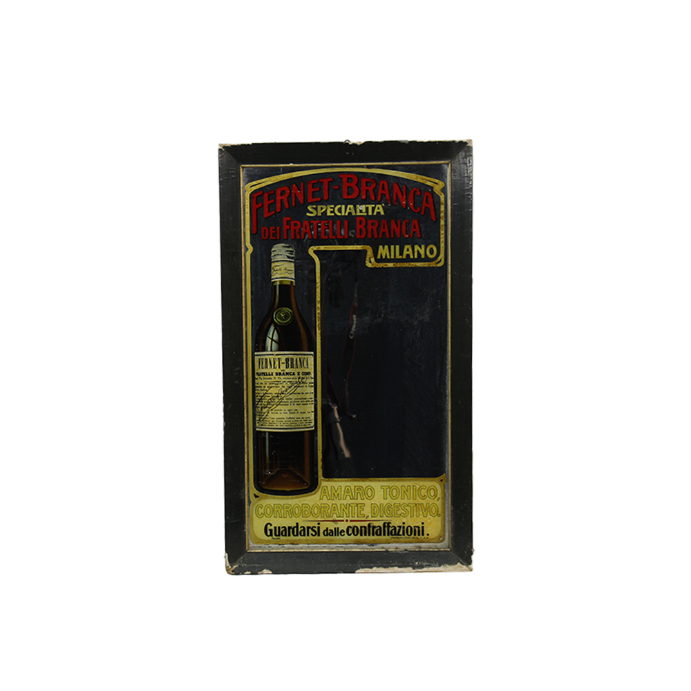 SPECCHIO PUBBLICITARIO Fernet Branca raffigurante l'iconica bottiglia della ditta di liquori milanese. Usure sulla cornice. Italia anni 50 h cm 55 x 32
