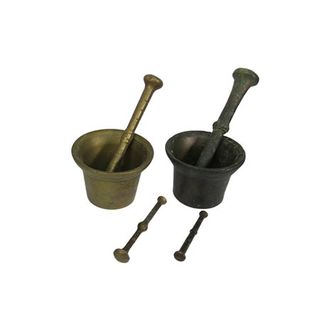LOTTO COMPOSTO DA 2 mortai d'epoca e 4 pestelli in bronzo. Usure e patine del tempo. Italia meta' del XX secolo cm Ø 9,5 - cm Ø 10