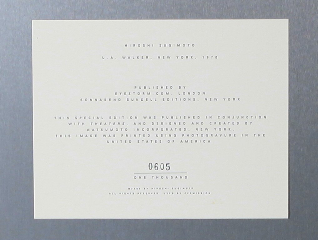 literature: Hiroshi Sugimoto, Theaters, text by Hans Belting, Sonnabend Sundell Editions, p.61