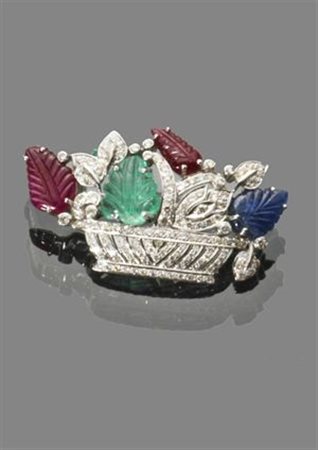 SPILLA Spilla in oro bianco a forma di cestino floreale con diamanti taglio brillante per complessivi ct 1,81 e smeraldo , zaffiro , rubini incisi a forma di foglia per complessivi ct 13,00 Peso gr 17,00 White gold floral basket shaped brooch with brillant cut diamonds totaling 1,81 kt leaf shaped emerald sapphire and rubies total 13,00 kt Weight 17.00 gr