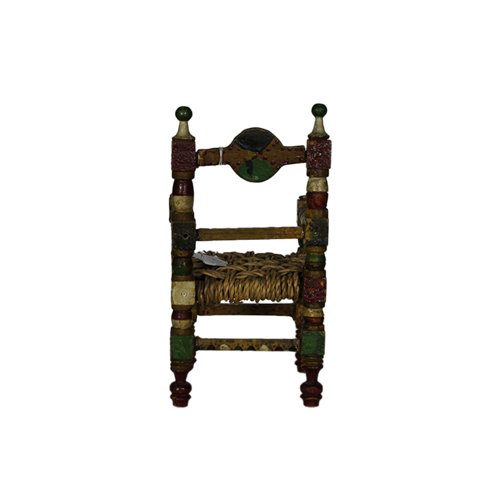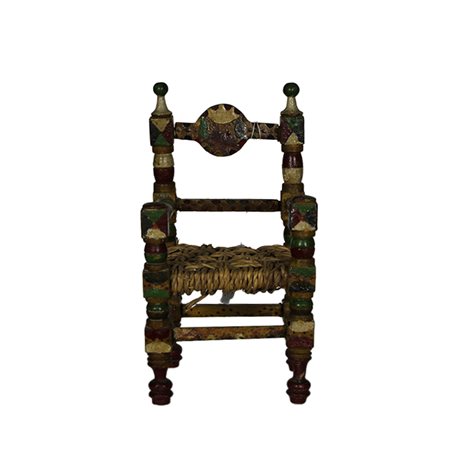 MODELLINO DI POLTRONCINA decoro siciliano, in legno policromo e cordino. Italia primi del 900 h cm 17 x 9,5 x 9,5