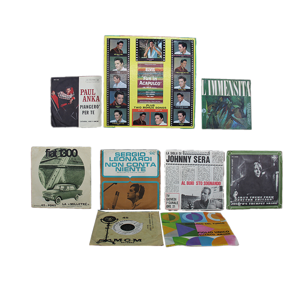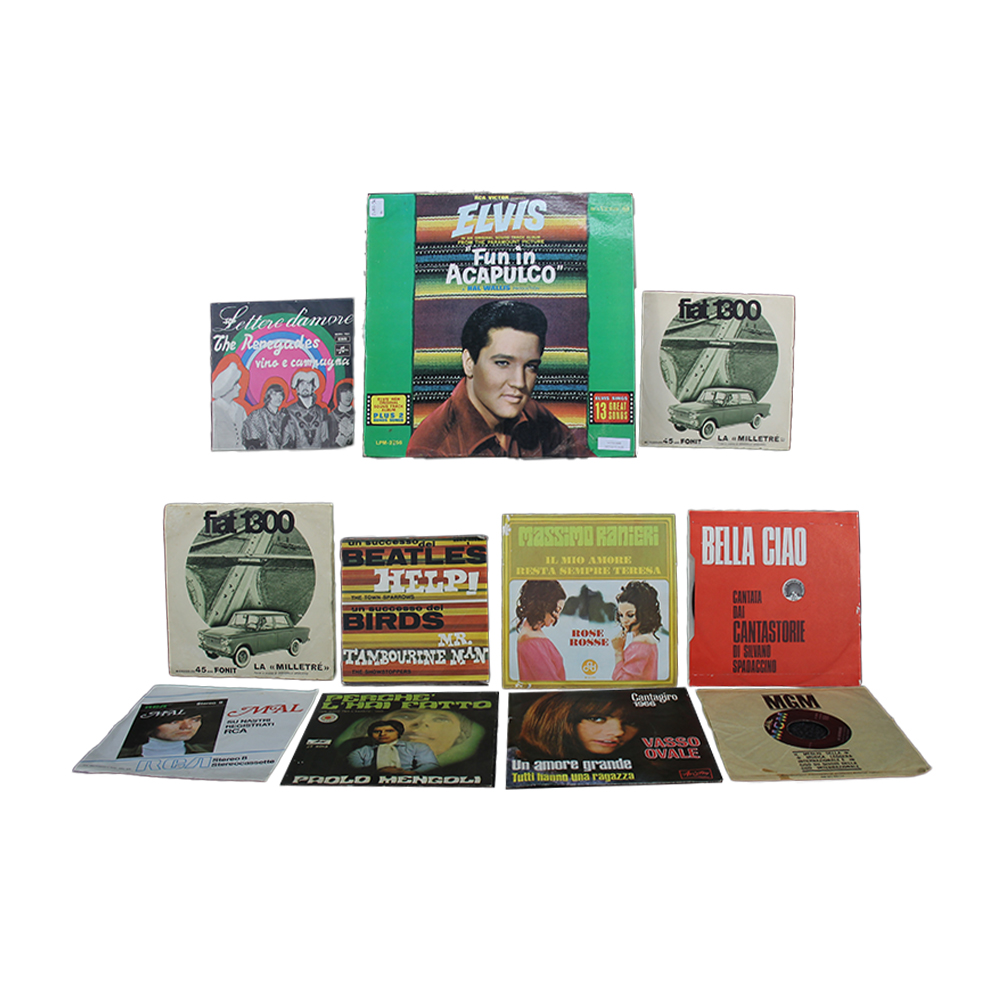 LOTTO DI 18 VINILI D'EPOCA 45 GIRI tra cui raro Help dei Beatles con Mr tamburine man dei Birds, Pop successi serie rossa e 3 dischi promozionali Fiat storici con voce di Domenico Modugno, più un vinile 33 giri Fun in Acapulco di Elvis Presley. Discrete condizioni con usure sulle copertine dei dischi. Varie provenienze anni 5060/70 del XX sec misure varie