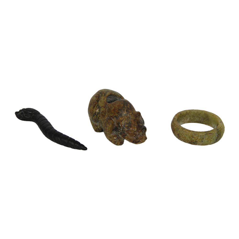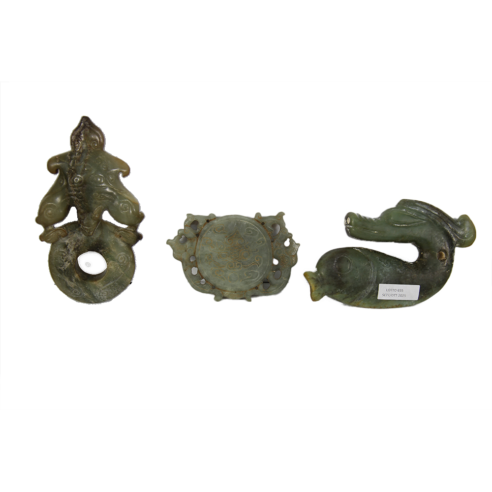 LOTTO COMPOSTO DA 6 antiche sculturine in giada cinese raffiguranti figure zoomorfe, un bracciale ed uno stemma. Epoche diverse misure varie