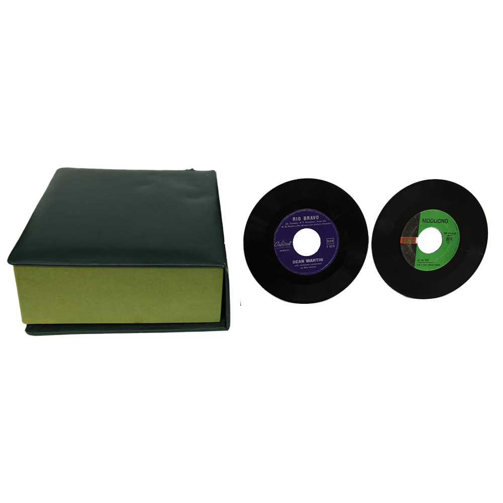 CONTENITORE CON DENTRO 33 VINILI 45 GIRI di vari cantanti italiani e stranieri di cui Frank Sinatra e Albano. Discrete condizioni d'usura. Diverse provenienze anni 50/60/70 del XX sec h cm 10 x 22
