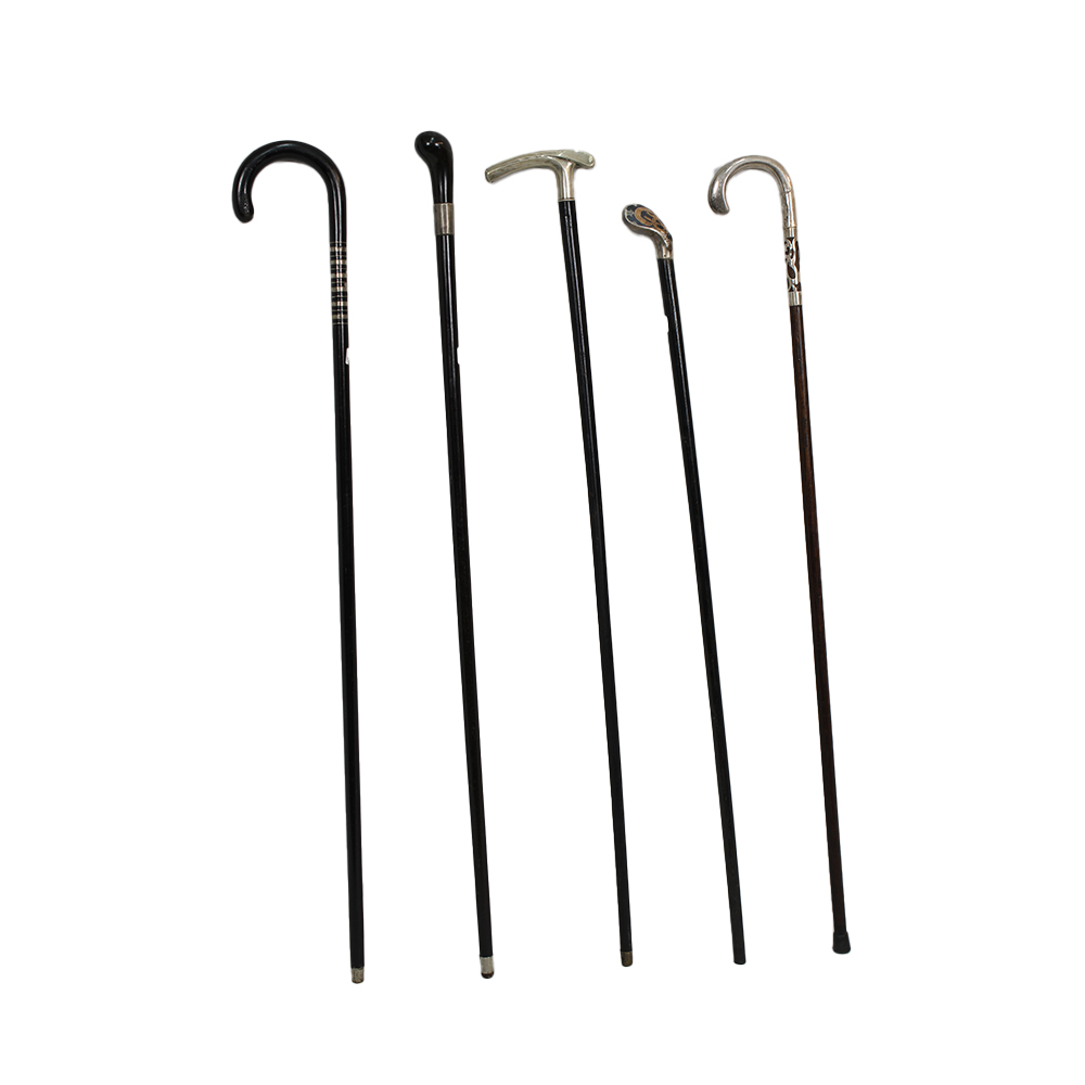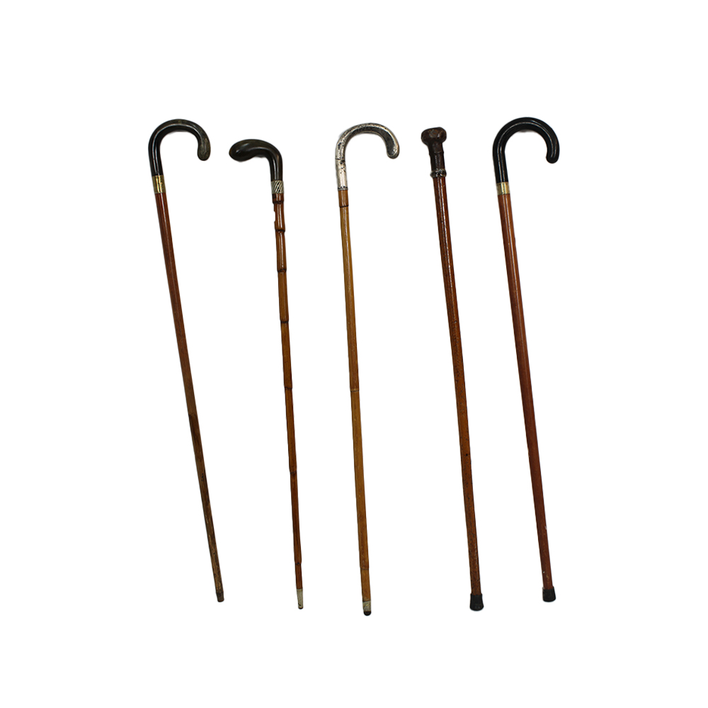 LOTTO DI 10 ELEGANTI BASTONI DA PASSEGGIO D'EPOCA di diversa fattura in legno, definizioni in metallo. XX sec misure varie