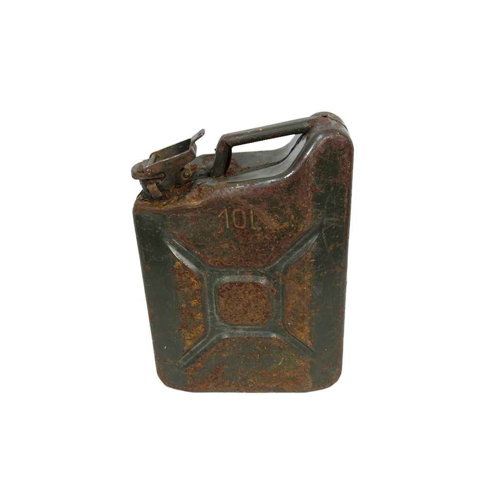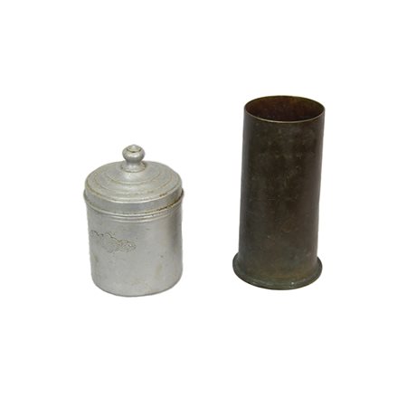 LOTTO COMPOSTO DA 1 grande bossolo da cannone in ottone, 1 tanica militare d'epoca e un contenitore per zucchero dell'Esercito Italiano. Usure del tempo, Italia anni 40/50 misure varie