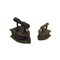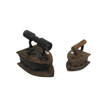 LOTTO DI DUE FERRI DA STIRO A CARBONE in ghisa finitura ruggine anticata. Metà del XX secolo h cm 24 x 18 x 28 - h cm 16 x 15 x 20