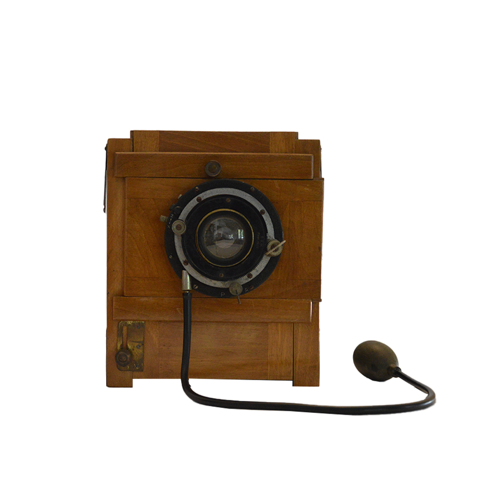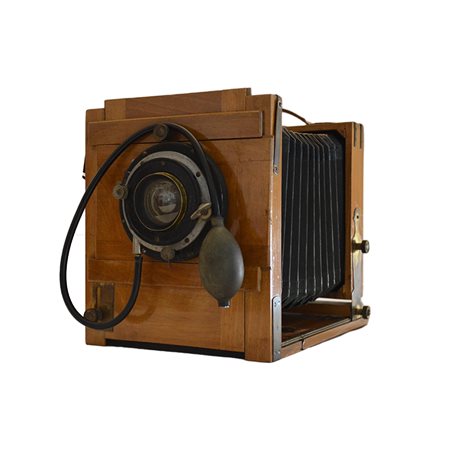 Macchina fotografica a soffietto con treppiedi Rara macchina fotografica a soffietto con treppiedi originale in legno altezza 130 cm. Completa di lastre e flash al magnesio originale. Più telo nero .Provenienza Italia fine 1800.In ottime condizioni. h cm 26 x 23 x 33