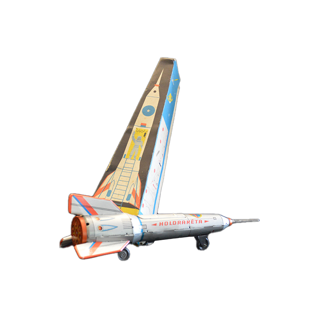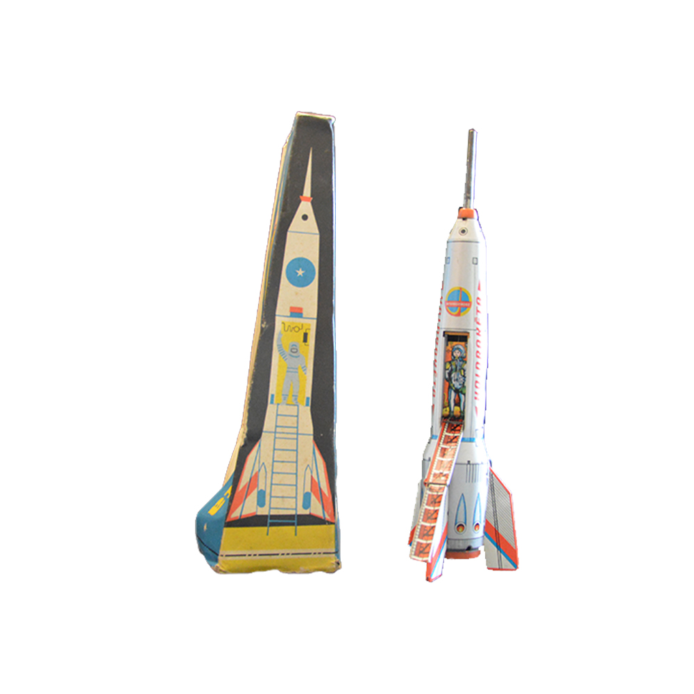 Razzo a frizione con scatola Giocattolo in latta serigrafata origine Ungheria a frizione in perfette condizioni, fine anno 1970 h cm 40 x 11 x 11
