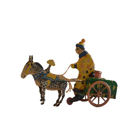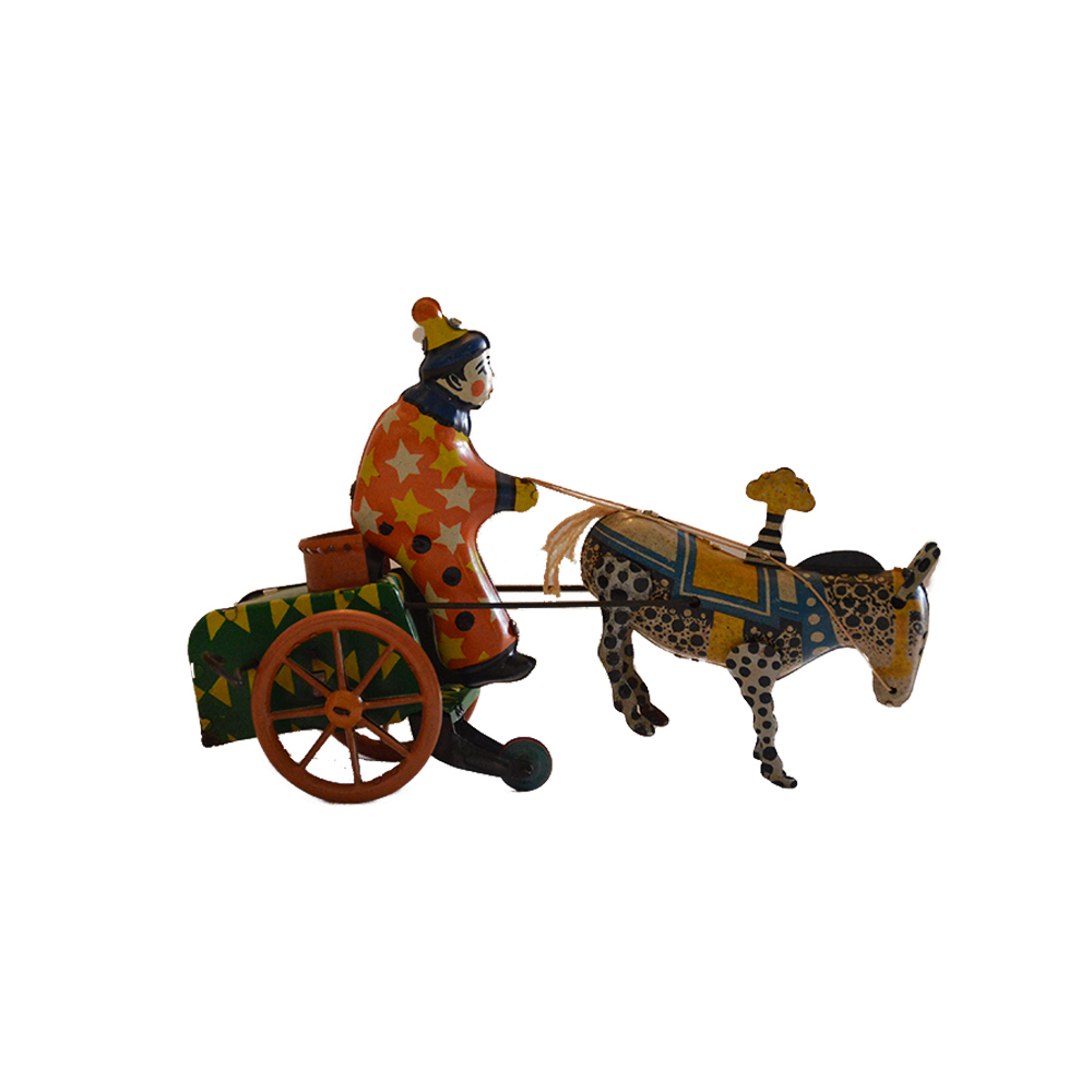 Clown con zebra con scatola Giocattolo in latta serigrafata provenienza URSS in buone condizioni, anno 1940. h cm 13 x 9 x 19