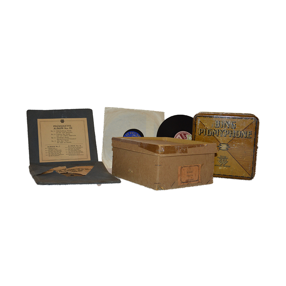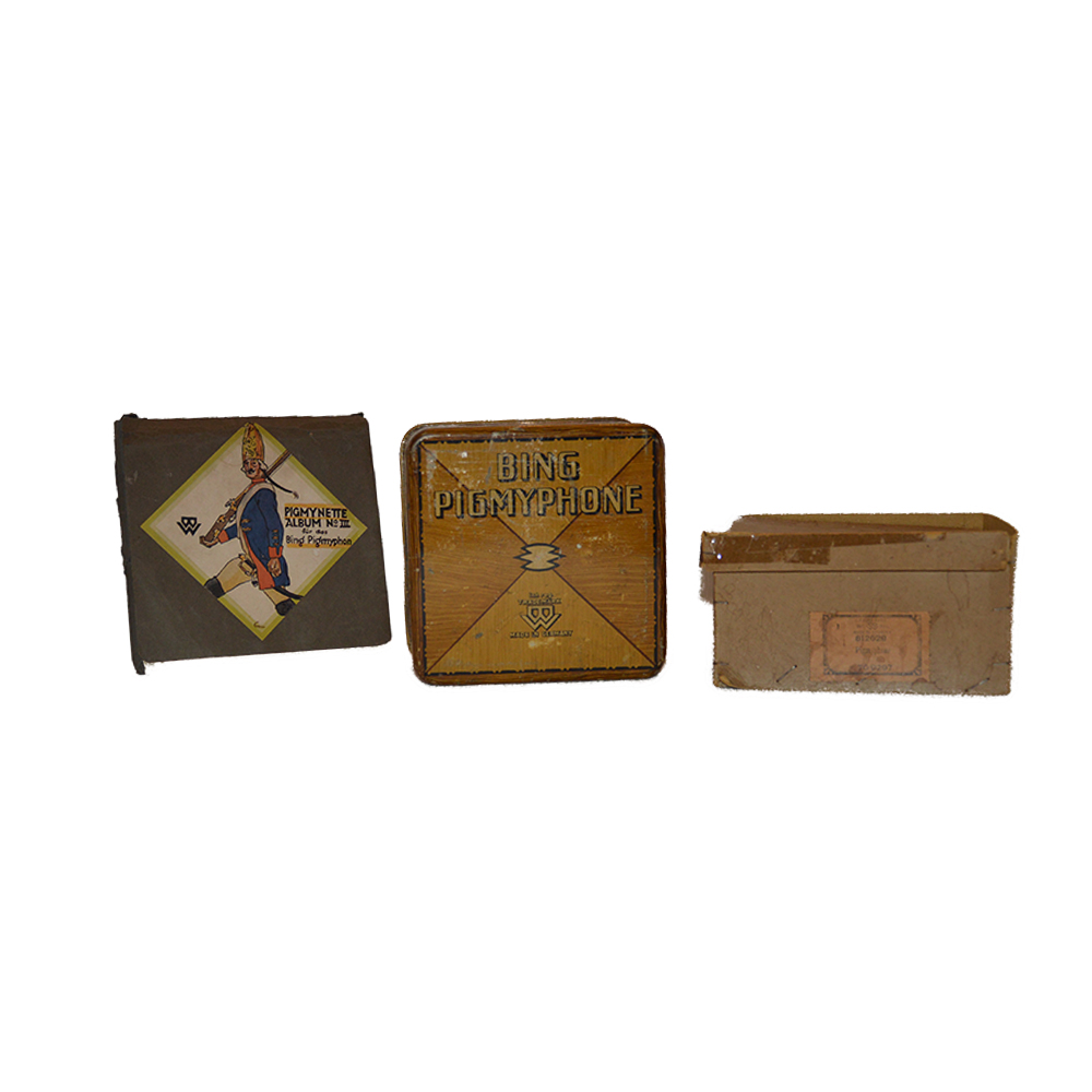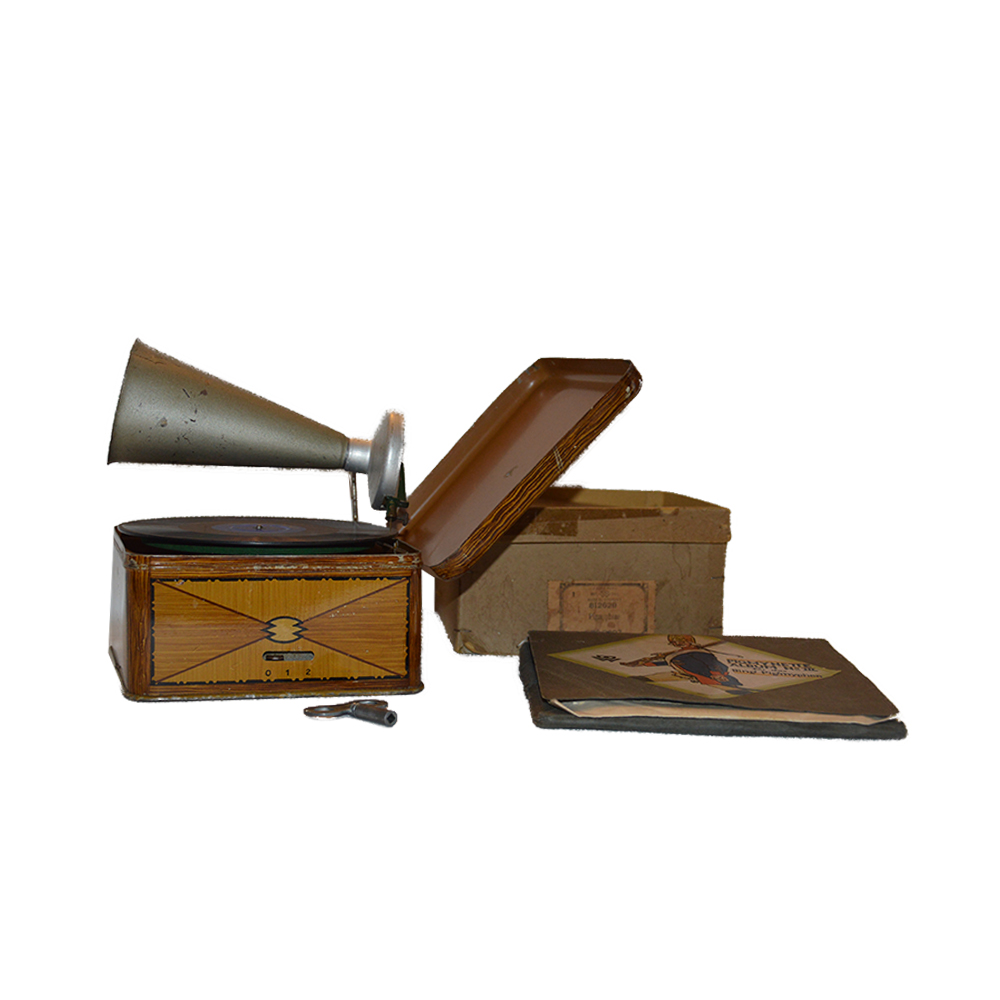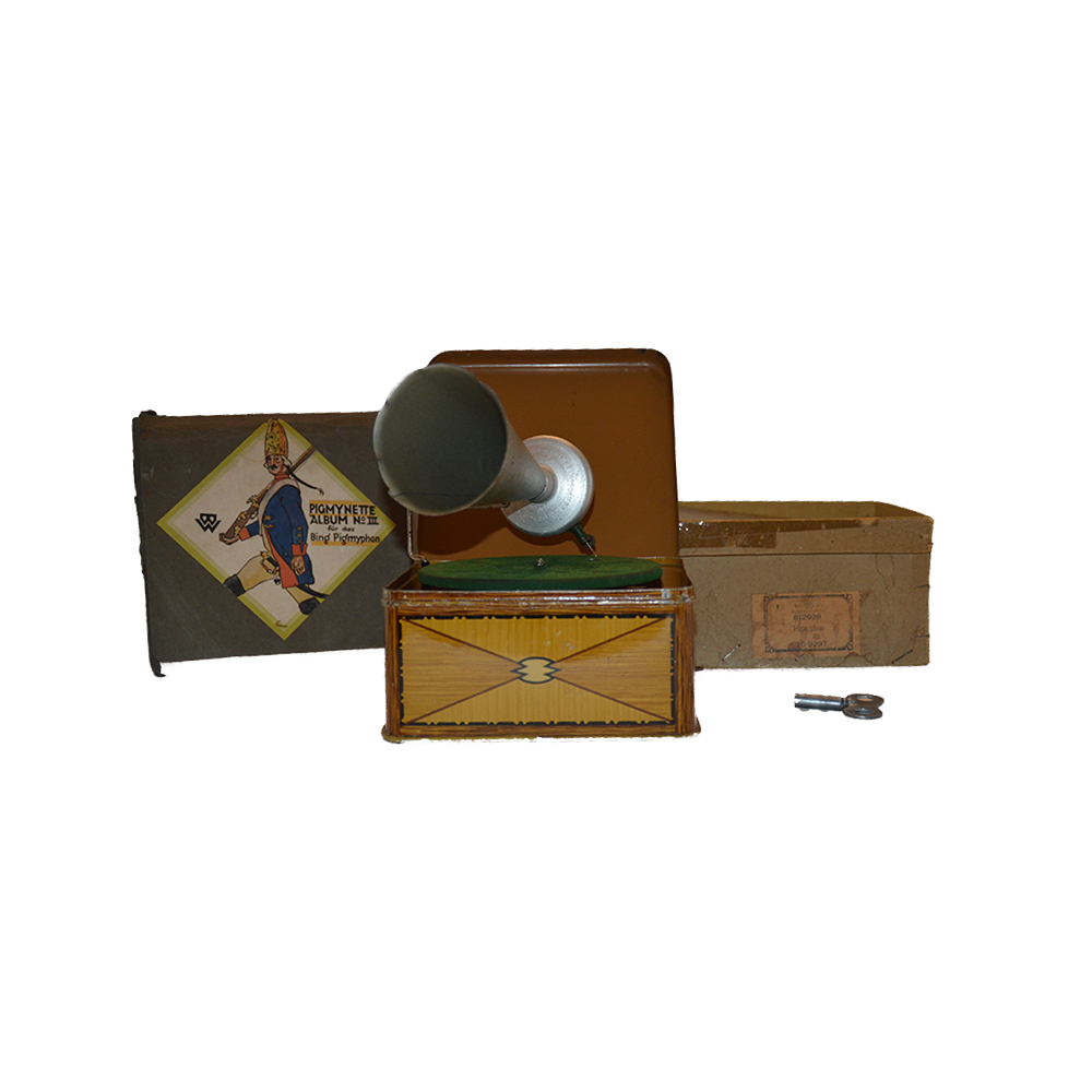 Giradischi Bing pigmyphone Gioco giradischi in lstta serigrafata perfettamente funzionante con relativi quattro dschi chiave originale, provenienza Germania ditta Gebruder Bing anno 1920, molto raro in queste condizioni. h cm 8 x 15 x 15