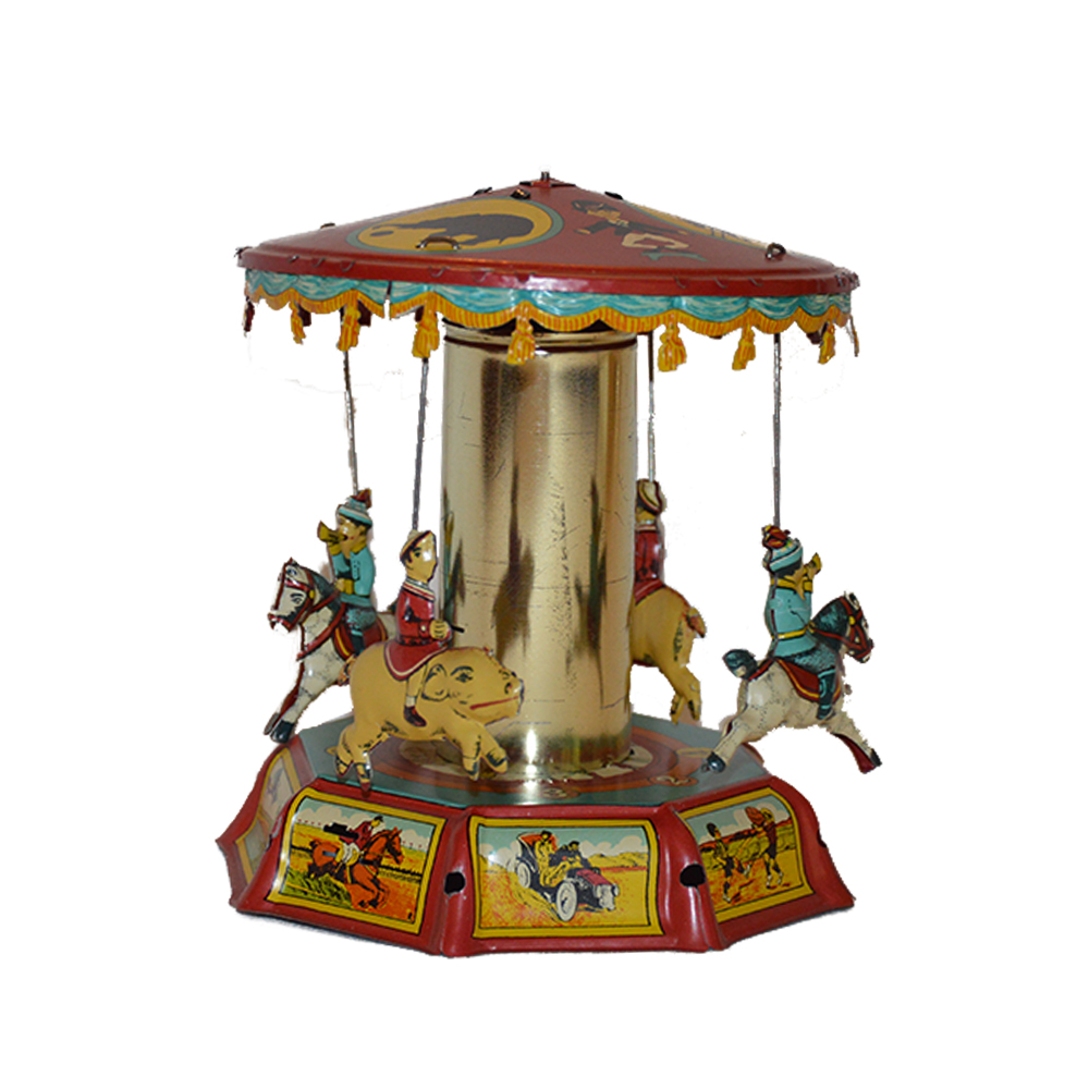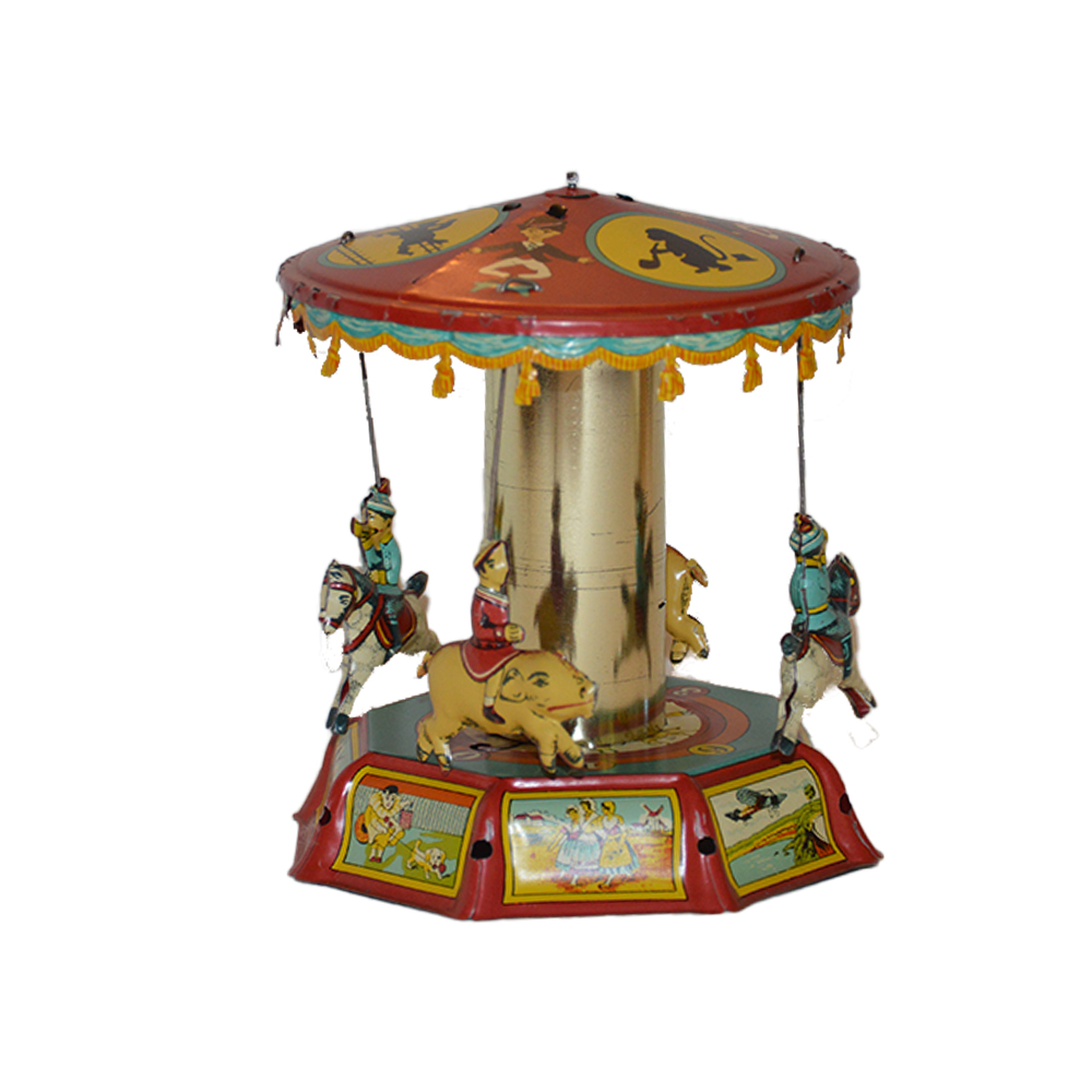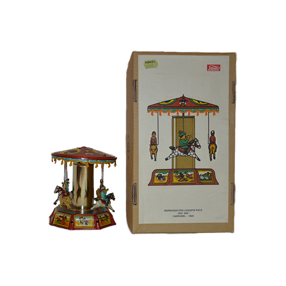 Giostra con scatola edizione limitata Giostra in latta serigrafata in ottime condizioni, provenienza Spagna ditta Paya. Riproduzione di un gioco del 1929, con scatola, edizione limitata numero 3856 di 5000 esemplari con certificato anno 1990. h cm 17 x 15 x 15