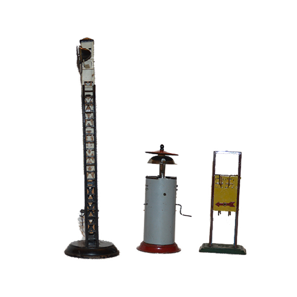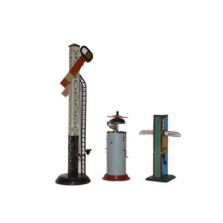 Accessori per stazione treni ditta Bing Tre segnalatori di stazione in latta serigrafata prov Germania ditta Bing in ottime condizioni. Anno 1920 h cm 19 x 8 x 8 - h cm 15 x 8 x 8 - h cm 14 x 7 x 4