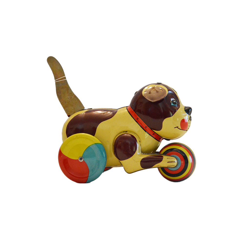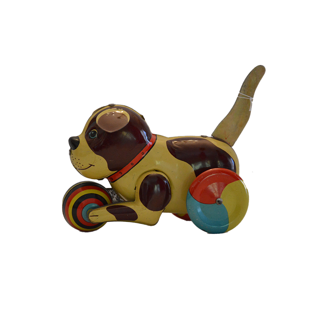 Cagnolino in latta serigrafata Cane in latta serigrafata con carica a molla (abbassando la coda si carica) in ottime condizioni provenienza Cina anno 1980 h cm 15 x 8 x 16