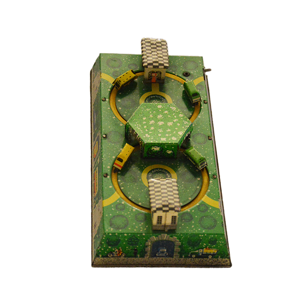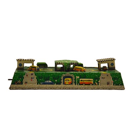 Pista con stazione di servizio Gioco in latta serigrafata stazione di servizio per autobus e pista, funzionamento a molla in buone condizioni provenienza sconosciuta. h cm 6 x 12 x 24