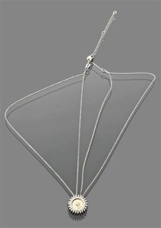 COLLANA Collana in oro bianco con pendente a forma di sole in oro rosso e bianco contornato da diamanti taglio brillante per complessivi ct 0,95 ca Peso gr 7,30 Firmato RE CARLO White gold necklace with pendant with gold sun surrounded by red and white brilliant cut diamonds totaling about 0.95 ct Weight 7.30 gr Signed RE CARLO