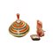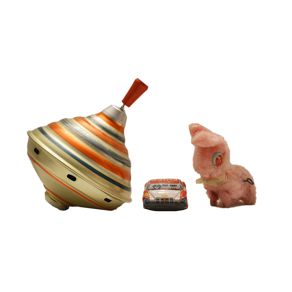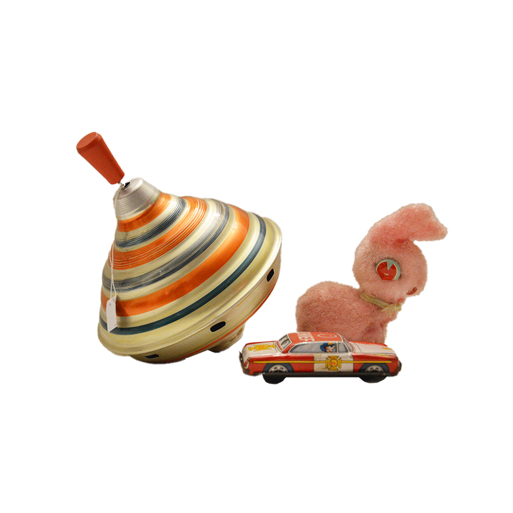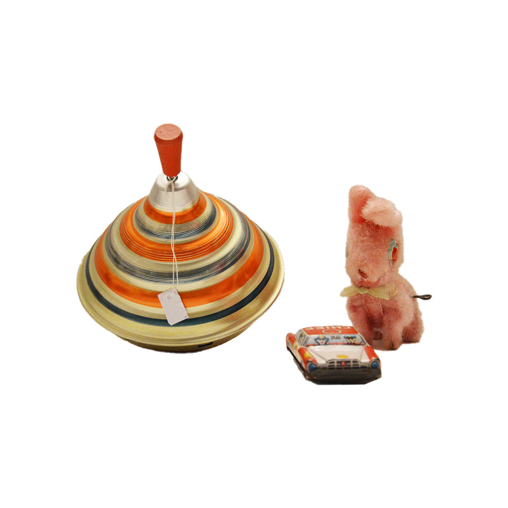 Giochi in latta a frizione Lotto che comprende una trottola in latta serigrafata, una macchinina della polizia in latta serigrafata, un cagnolino in peluche a molla, provenienza Giappone e Gran Bretagna anno 1960. h cm 18 x 16 x 16