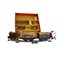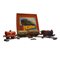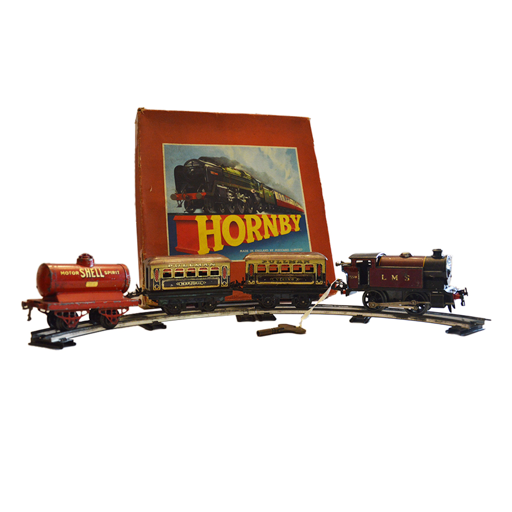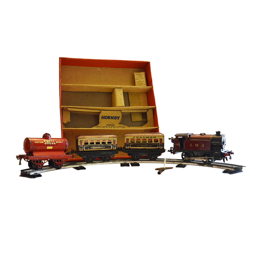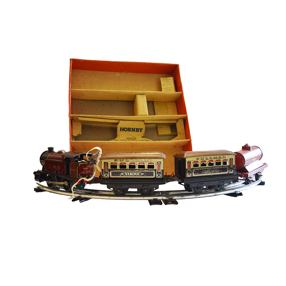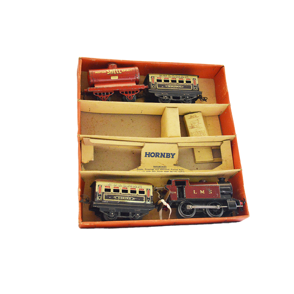 Trenino Hornby con scatola Trenino funzionamento a molla composto da una locomotiva, due vagoni passeggeri e una cisterna. Provenienza Gran Bretagna ditta Hornby in buone condizioni, lievi usure del tempo, anno 1940 binari a parte. h cm 6 x 17 x 8