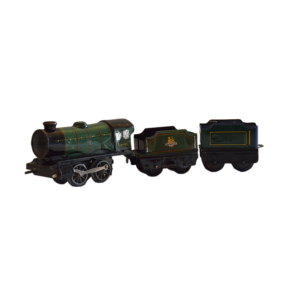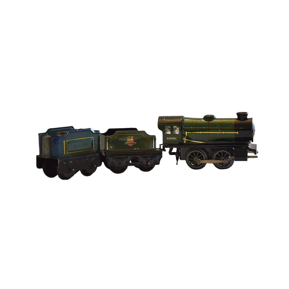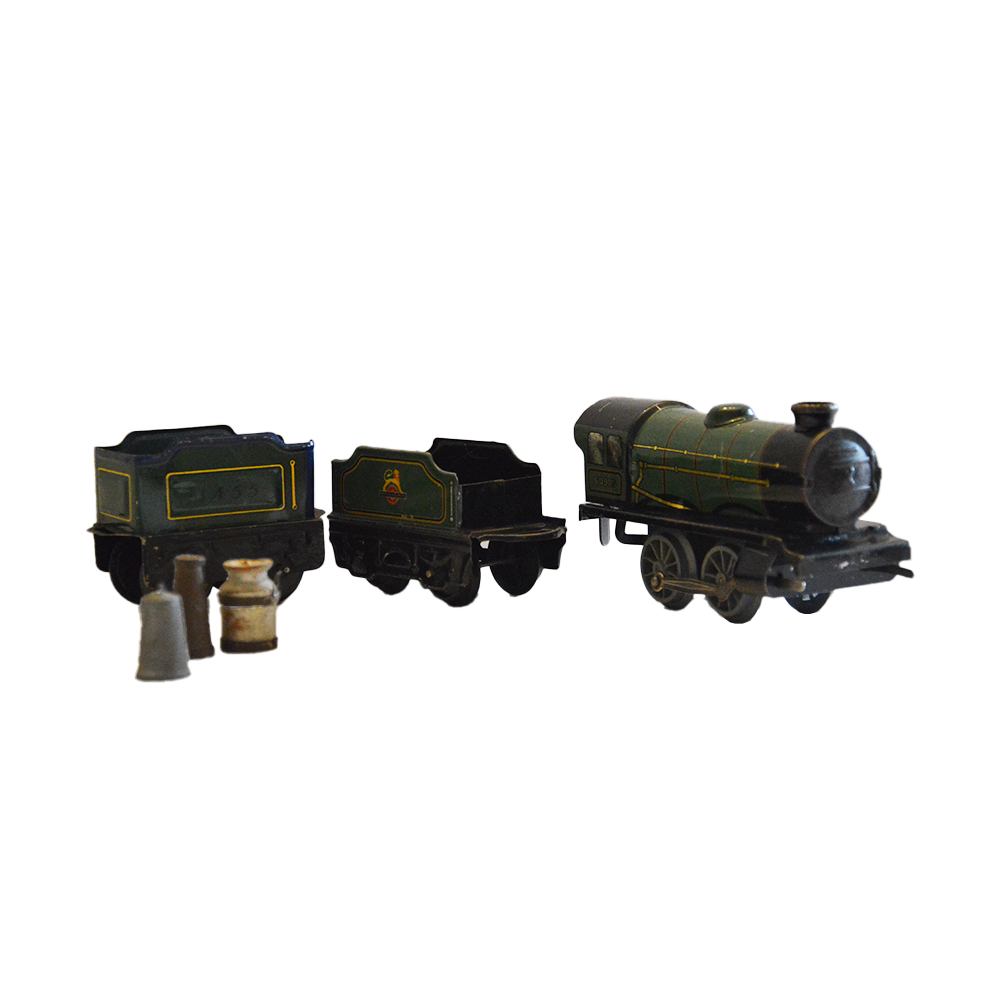 Treno Hornby a molla Set composto da una locomotiva, due vagoni merci e tre piccoli accessori provenienza Gran Bretagna ditta Hornby anno 1950 in ottime condizioni. h cm 7 x 6 x 12