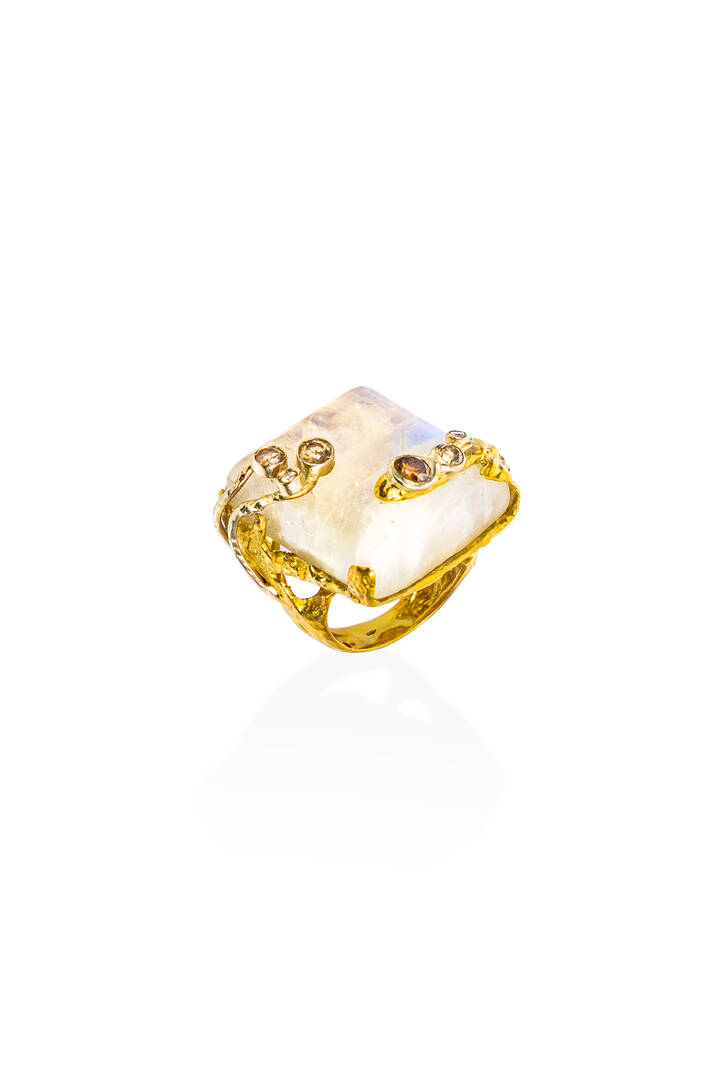 Grande anello scultura in oro giallo e bianco, con gambo interamente lavorato; al centro grande pietra di luna taglio carré cabochon. Diamanti taglio brillante di colore bianco e brown per totali ct 0,80 ca