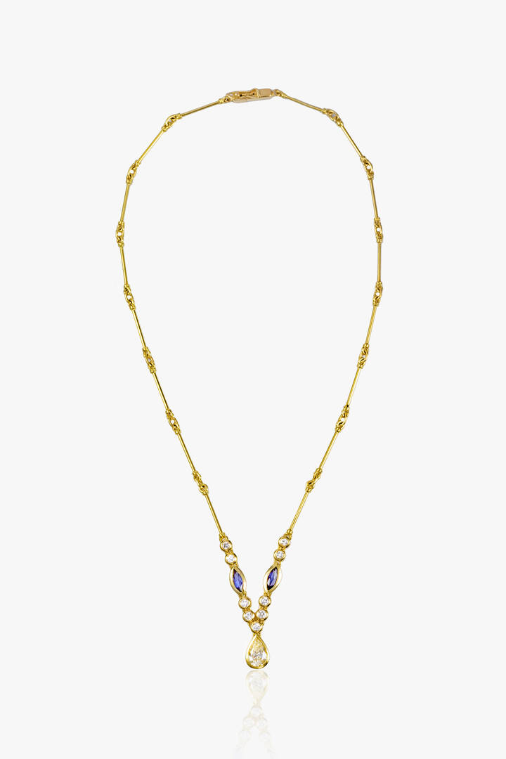in oro giallo composto da segmenti lisci, al centro diamante taglio a goccia di ct 1,0 ca e zaffiri navette per totali ct 0,70 ca e diamanti taglio brillante a decoro per totali ct 0,55 ca