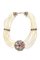 composto da sei fili di perle di acqua dolce di vari e dimensioni; al centro rosone in argento con gemme sintetiche e due smeraldi, due zaffiri, quattro rubini e due coralli, due turchesi. Barrette e chiusura in argento con gemme fini e di sintesi.
